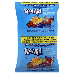 Browse our inventory for a full rainbow of Kool Aid flavors. Whether your crew prefers exotic choices like Kiwi Lime and Mega Mountain Cherry, or they go for old-school selections like Fruit Punch or Grape Kool Aid, bulk pricing makes it easy to keep a variety on hand. We carry the unusual and the classics from Blue Moon to Green Apple, Tropical Punch to Lemonade. We also stock several unsweetened varieties Kool Aid packets that let you control what kind of sweetener and how much goes in your drink.