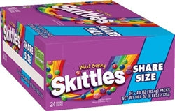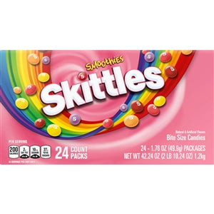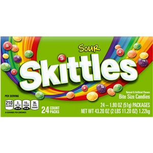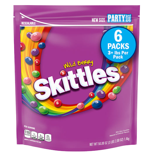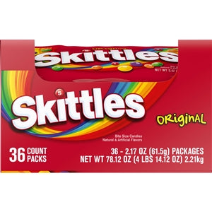 Find an array of bulk Skittles options in our inventory. From 360-count cases of 2.17-ounce boxes to 6-count cases of 41-ounce stand-up pouches, we've got your Skittles wholesale needs covered. We carry fun size selections of Skittles candy for Halloween handouts, peg packs for retail displays, theater boxes for stocking cinemas and more choices. Whether you're looking for a big bag of Skittles for your household or stocking up on Skittles vending machine supplies for your business, our selections save you time and money.