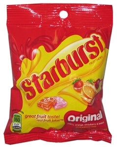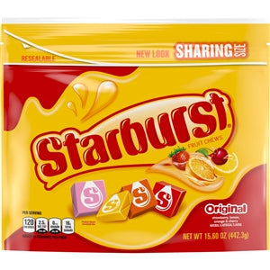 Find all your favorite Starburst flavors in our inventory. We carry many size choices for Starburst Original, which is still a crowd-pleaser, alongside more exotic selections like Starburst Sour Gummies and Tropical Fruit candy. For choosy snackers, go for Starburst Fave Reds, featuring only the most popular crimson-wrapped flavors like strawberry, watermelon and cherry. You'll also find value packs that feature a mix of Skittles, Lifesaver and Starburst candy. Dispenser-ready, shareable and single-serve sizes are available for most flavors.