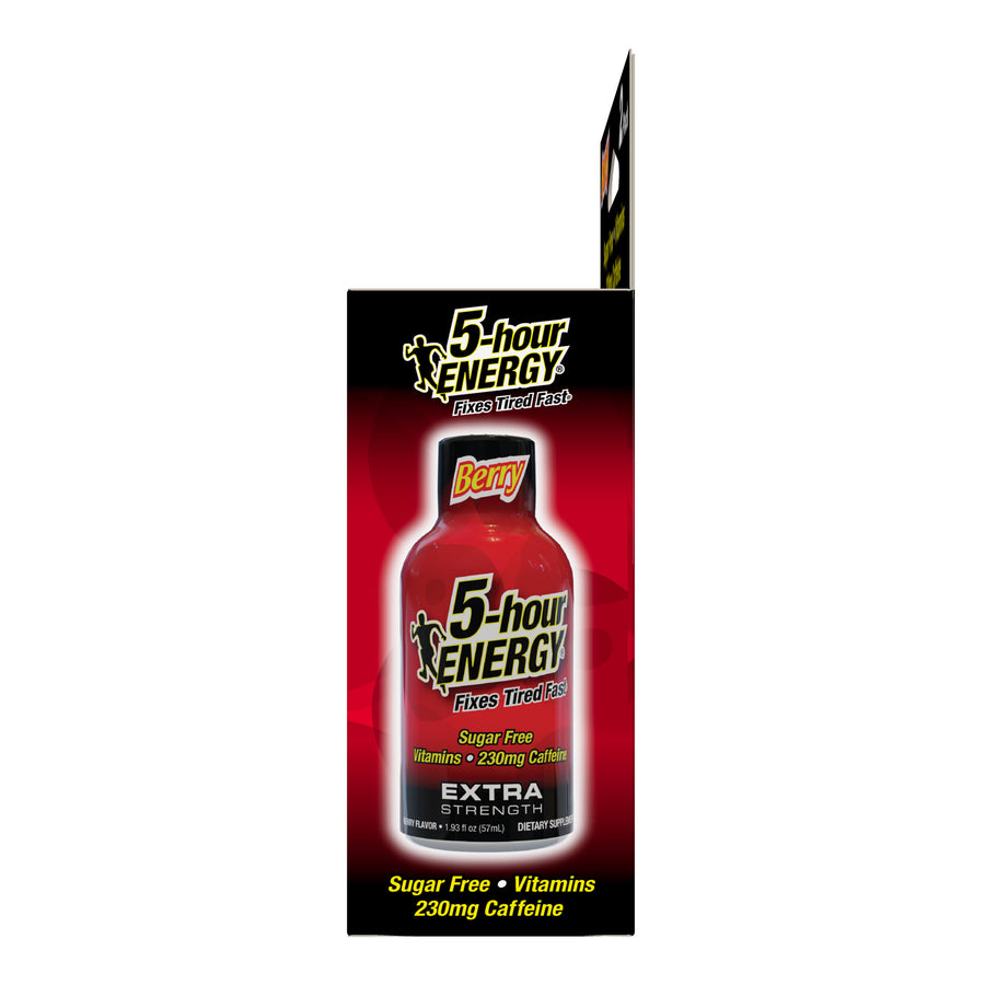 Need an extra boost to get through your day? Grab a Berry Extra Strength 5-hour ENERGY® shot. It’s packed with a big energy blend and big taste. The only thing small about it is its size. So, why sip yet another coffee when you can have a Berry Extra Strength 5-hour ENERGY® shot and get hours of energy? Berry Extra Strength 5-hour ENERGY® shots are packed with a blend of essential B-vitamins and amino acids, but no sugar or herbal stimulants.