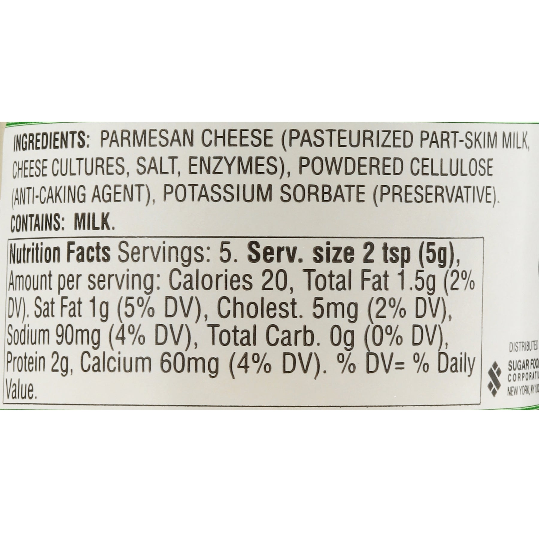 Ingredients | Parmesan Cheese (Pasteurized Part-Skim Milk, Cheese Cultures, Salt, Enzymes), Powdered Cellulose (Anti-Caking Agent), Potassium Sorbate (Preservative). |