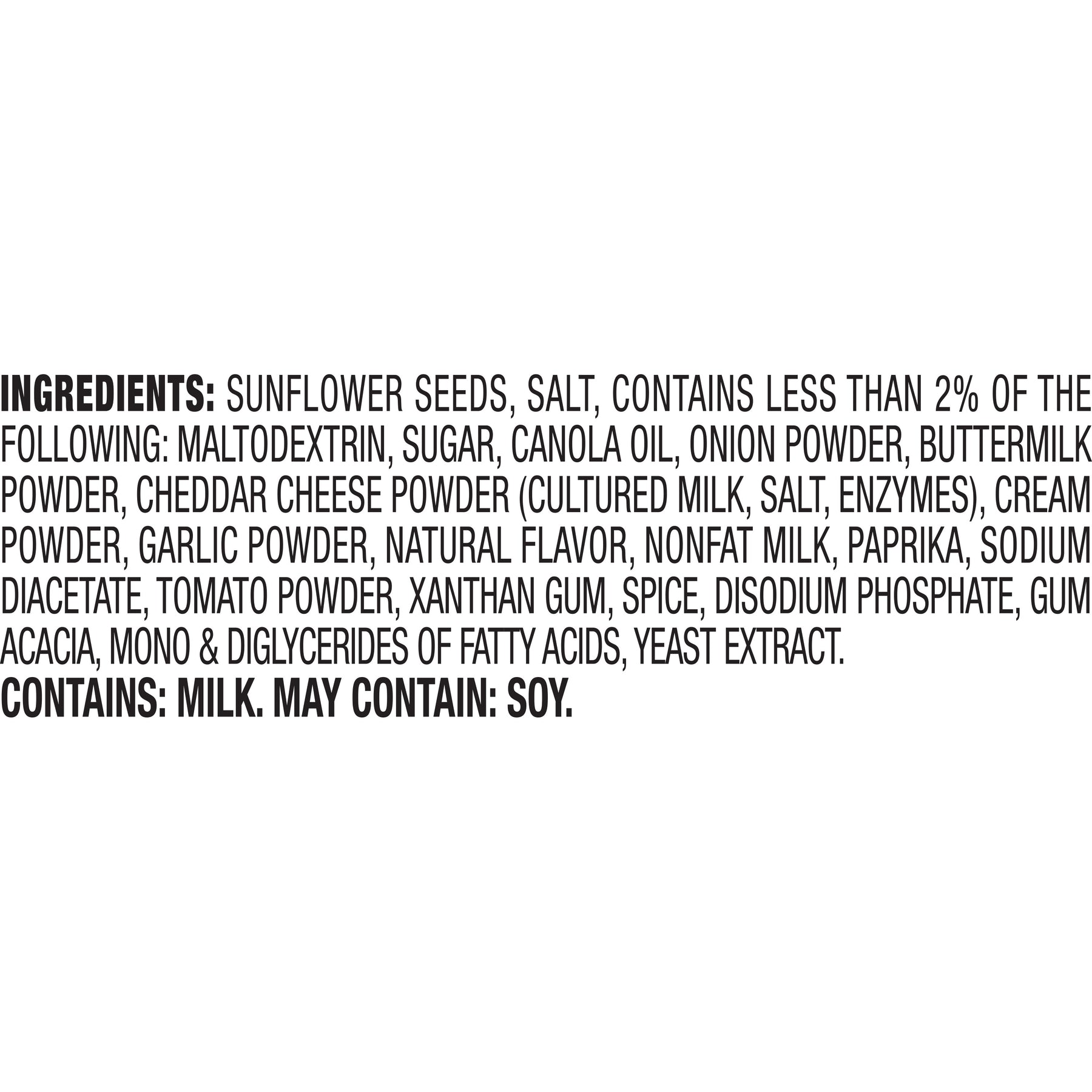 | Ingredients | Sunflower Seeds, Salt, Contains Less Than 2% Of The Following: Maltodextrin, Sugar, Canola Oil, Onion Powder, Buttermilk Powder, Cheddar Cheese Powder (Cultured Milk, Salt, Enzymes), Cream Powder, Garlic Powder, Natural Flavor, Nonfat Milk, Paprika, Sodium Diacetate, Tomato Powder, Xanthan Gum, Spice, Disodium Phosphate, Gum Acacia, Mono & Diglycerides Of Fatty Acids, Yeast Extract.Contains: Milk.May Contain: Soy. |