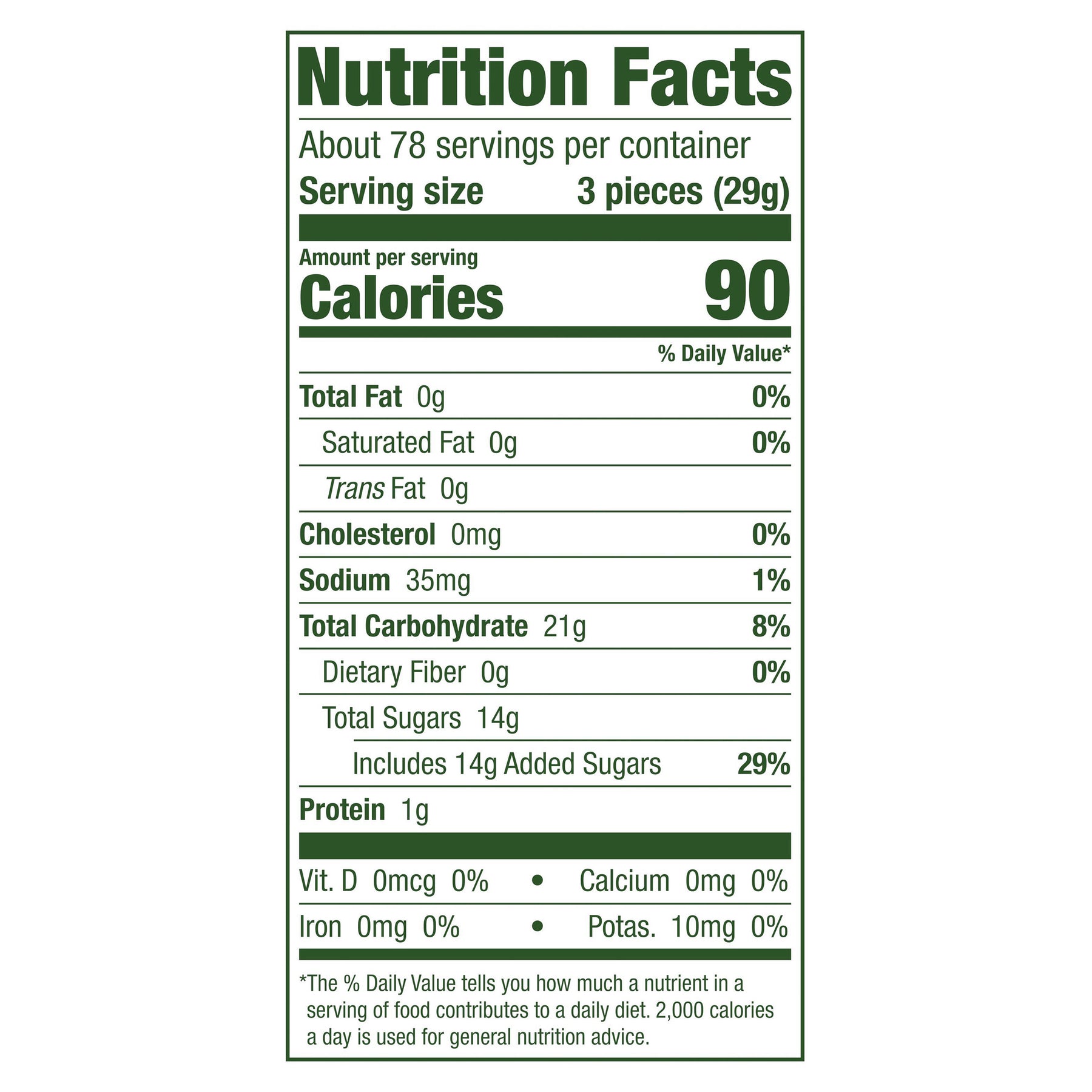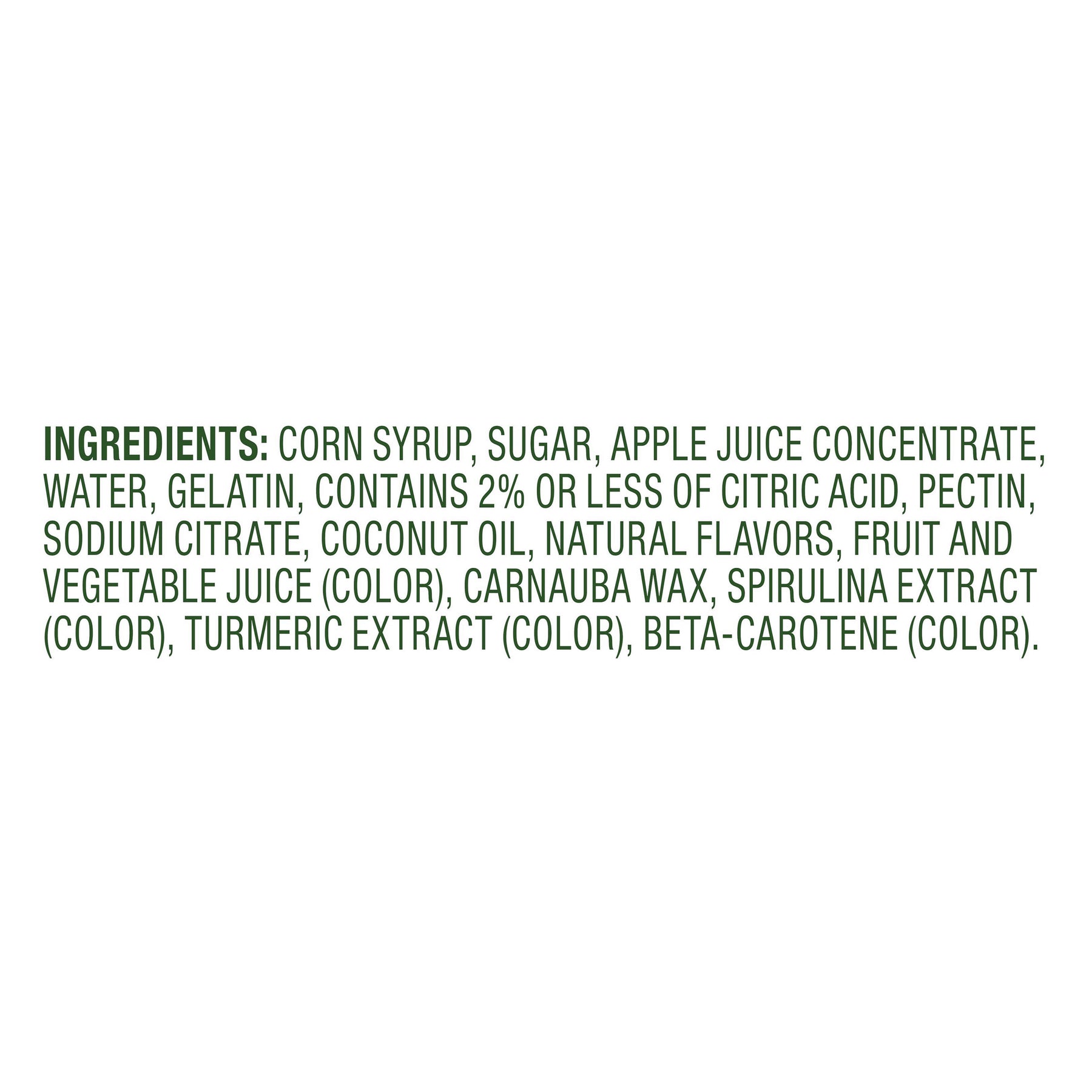 | Ingredients | Corn Syrup, Sugar, Apple Juice Concentrate Water, Gelatin, Contains 2% Or Less Of Citric Acid, Pectin, Sodium Citrate, Coconut Oil, Natural Flavors, Fruit And Vegetable Juice (Color), Carnauba Wax, Spirulina Extract (Color), Turmeric Extract (Color), Beta-Carotene (Color). |