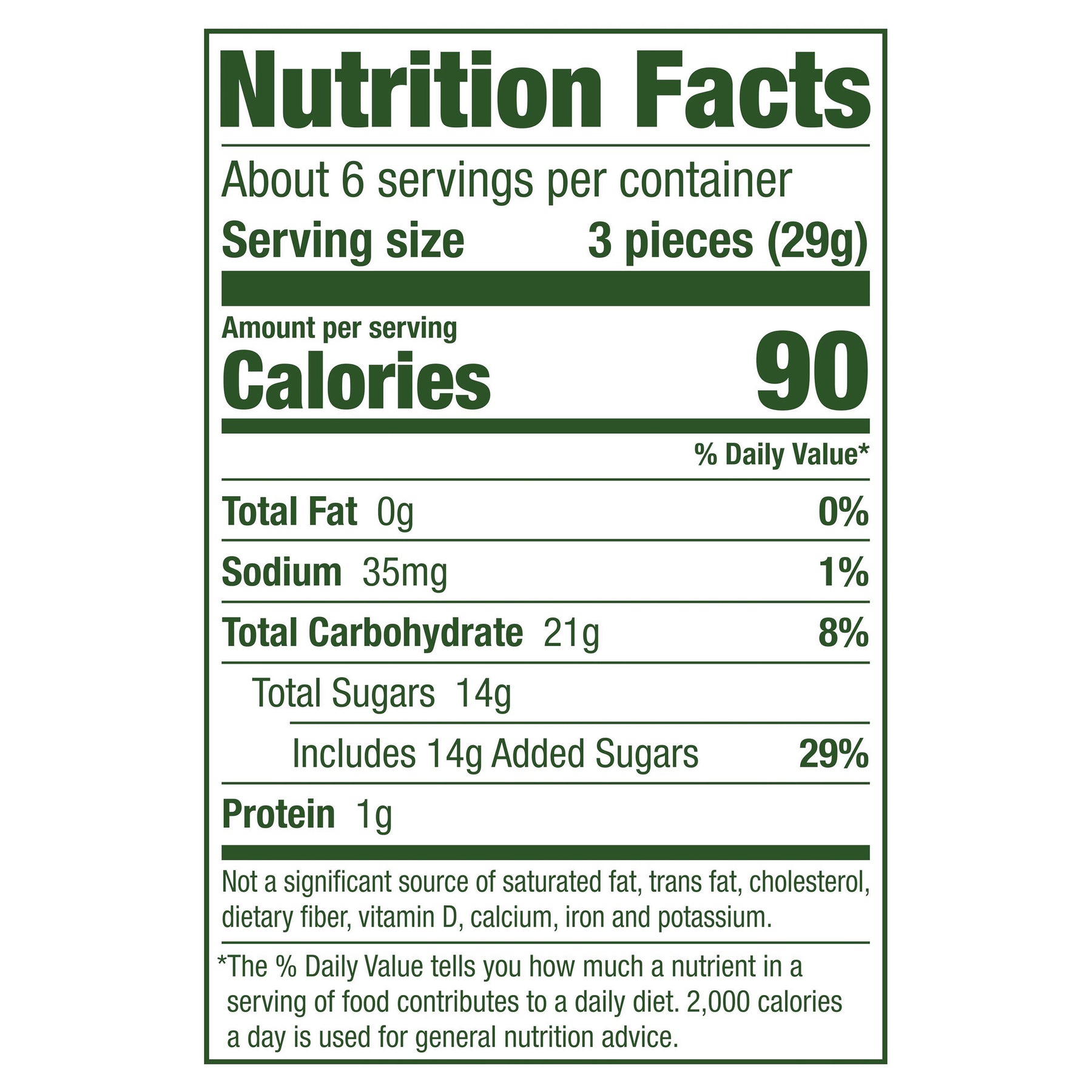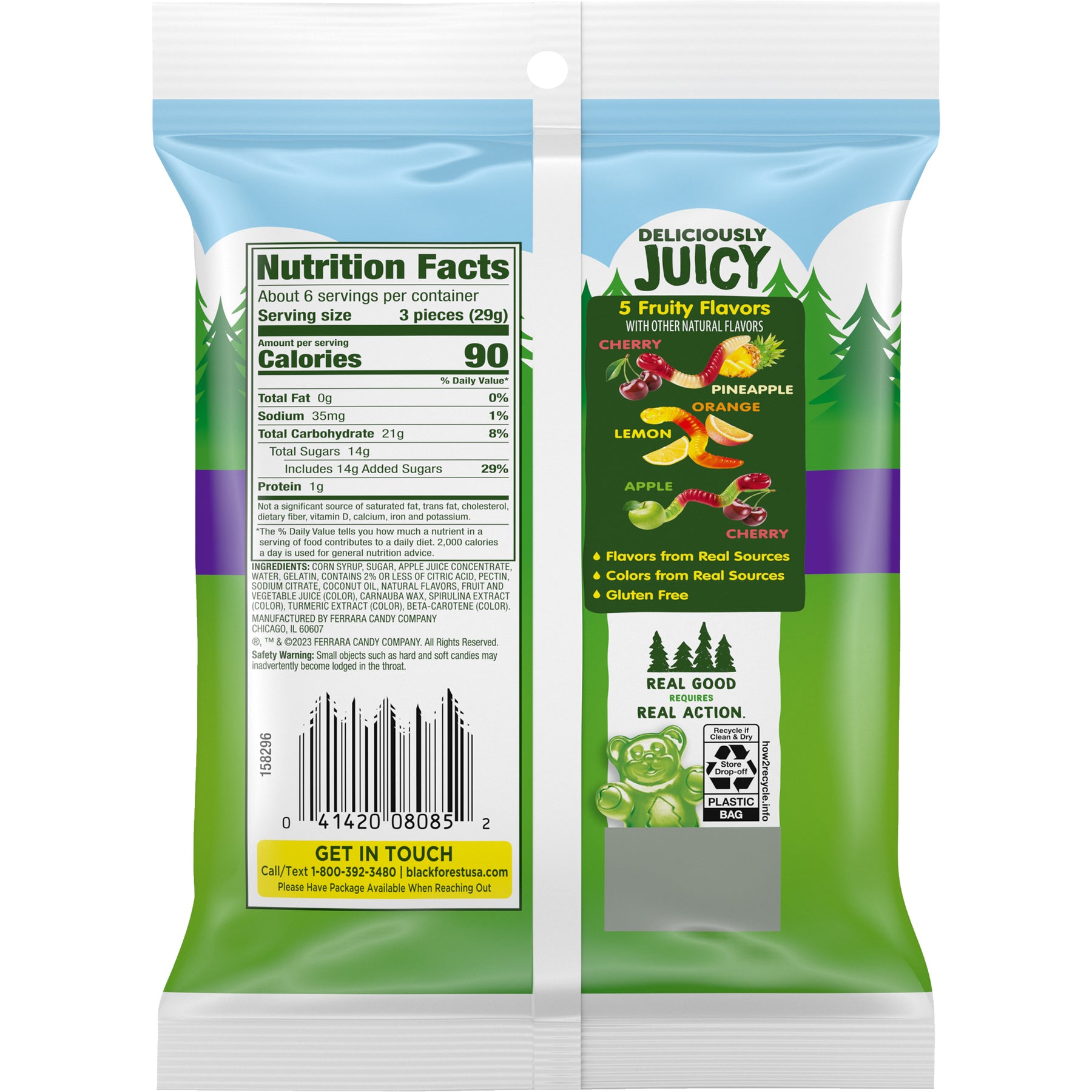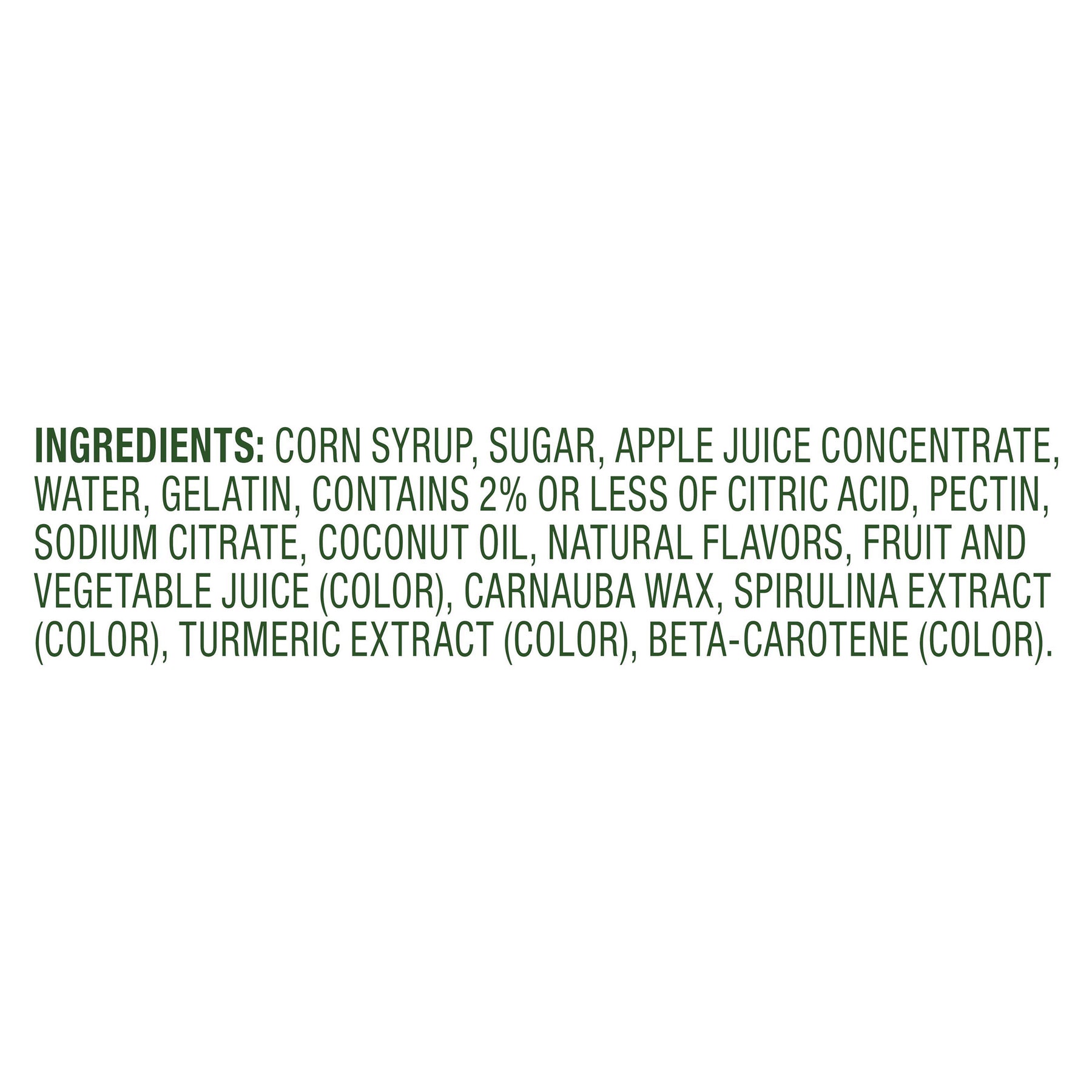 | Ingredients | Corn Syrup, Sugar, Apple Juice Concentrate, Water, Gelatin, Contains 2% Or Less Of Citric Acid, Pectin, Sodium Citrate, Coconut Oil, Natural Flavors, Fruit And Vegetable Juice (Color), Carnauba Wax, Spirulina Extract (Color), Turmeric Extract (Color), Beta-Carotene (Color). |