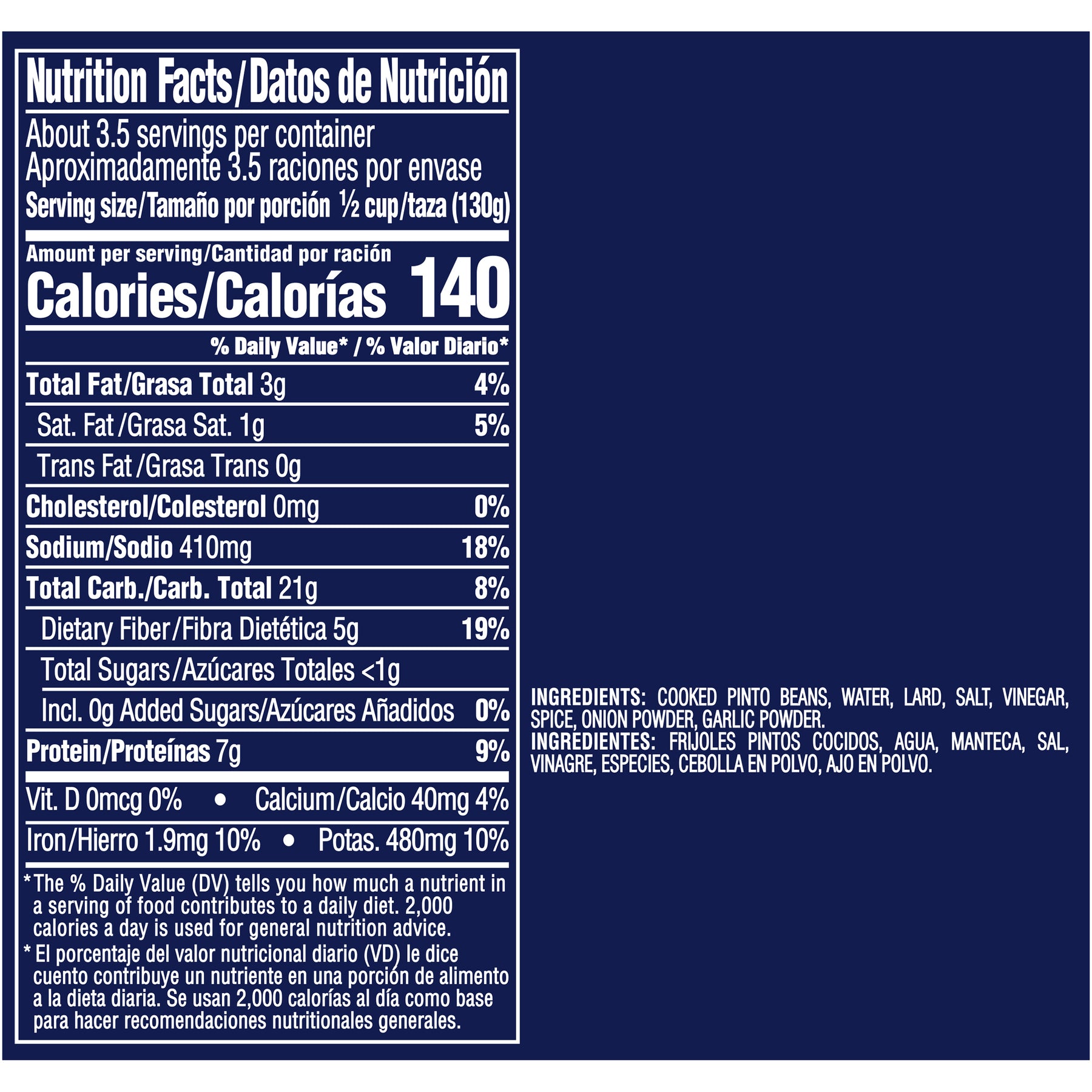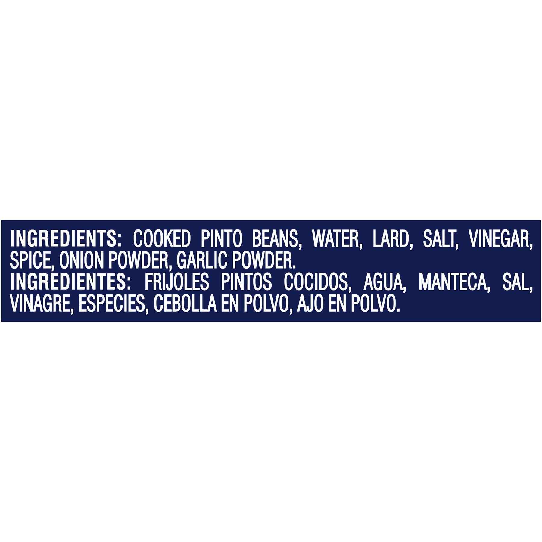 Ingredients | Cooked Pinto Beans, Water, Lard, Salt, Vinegar, Spice, Onion Powder, Garlic Powder. |