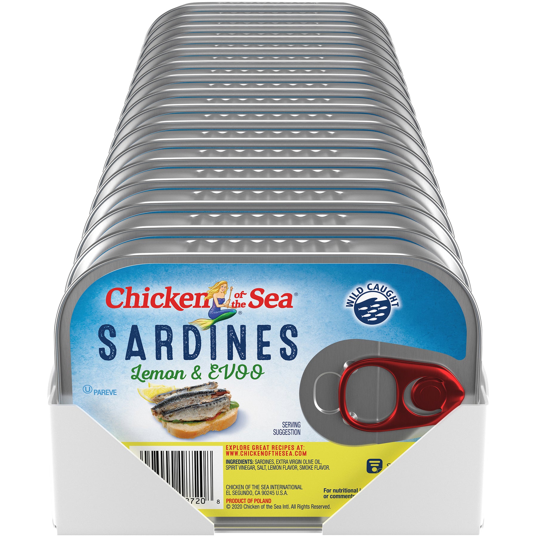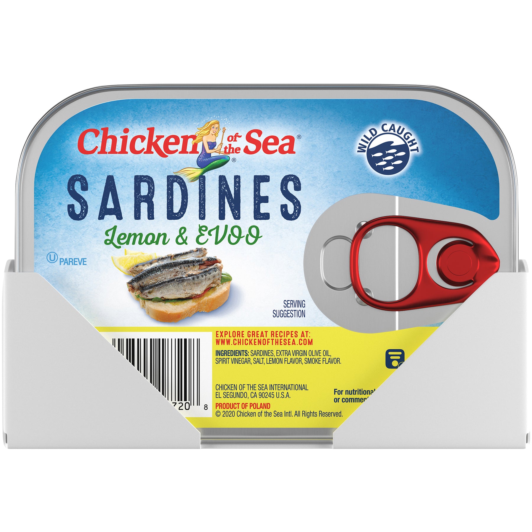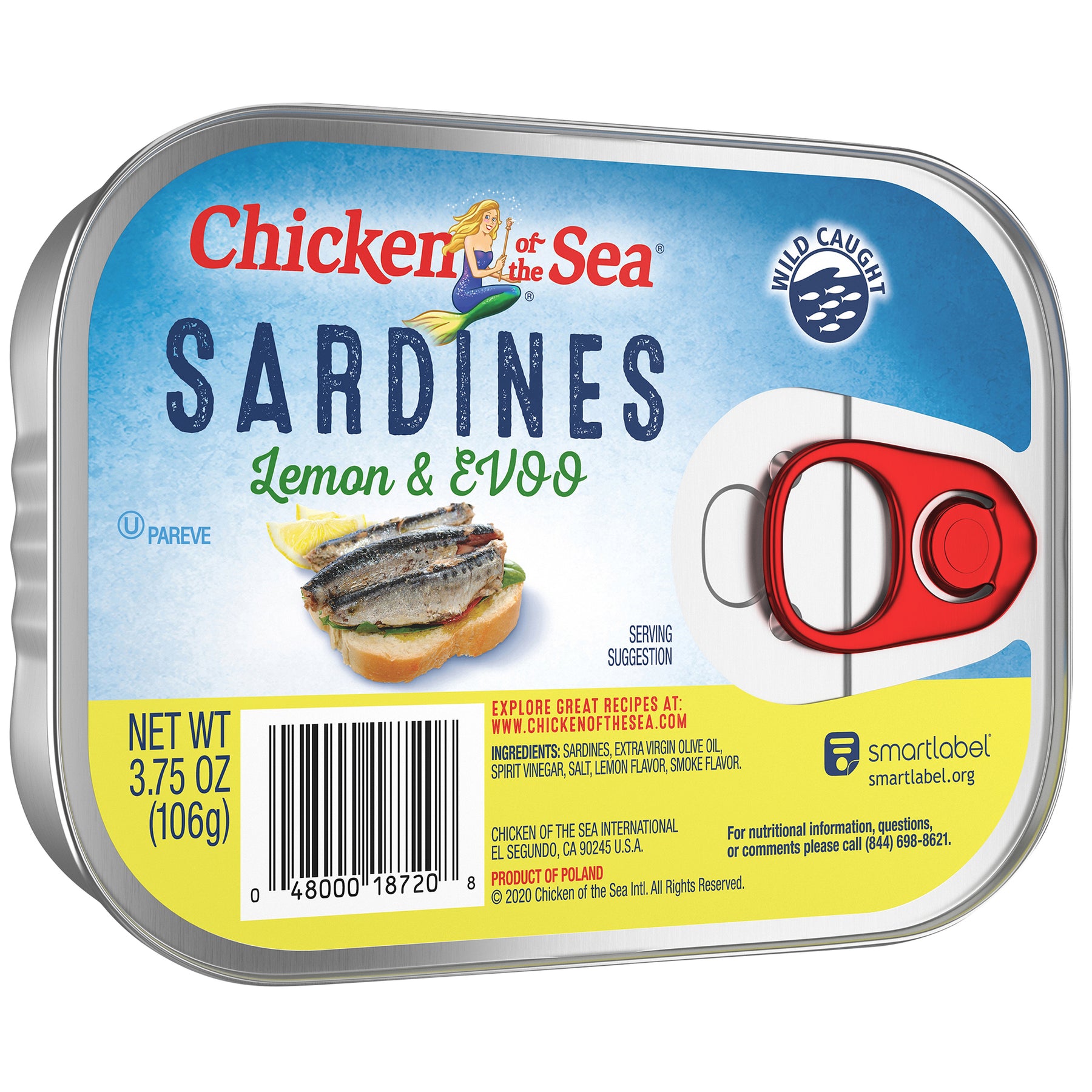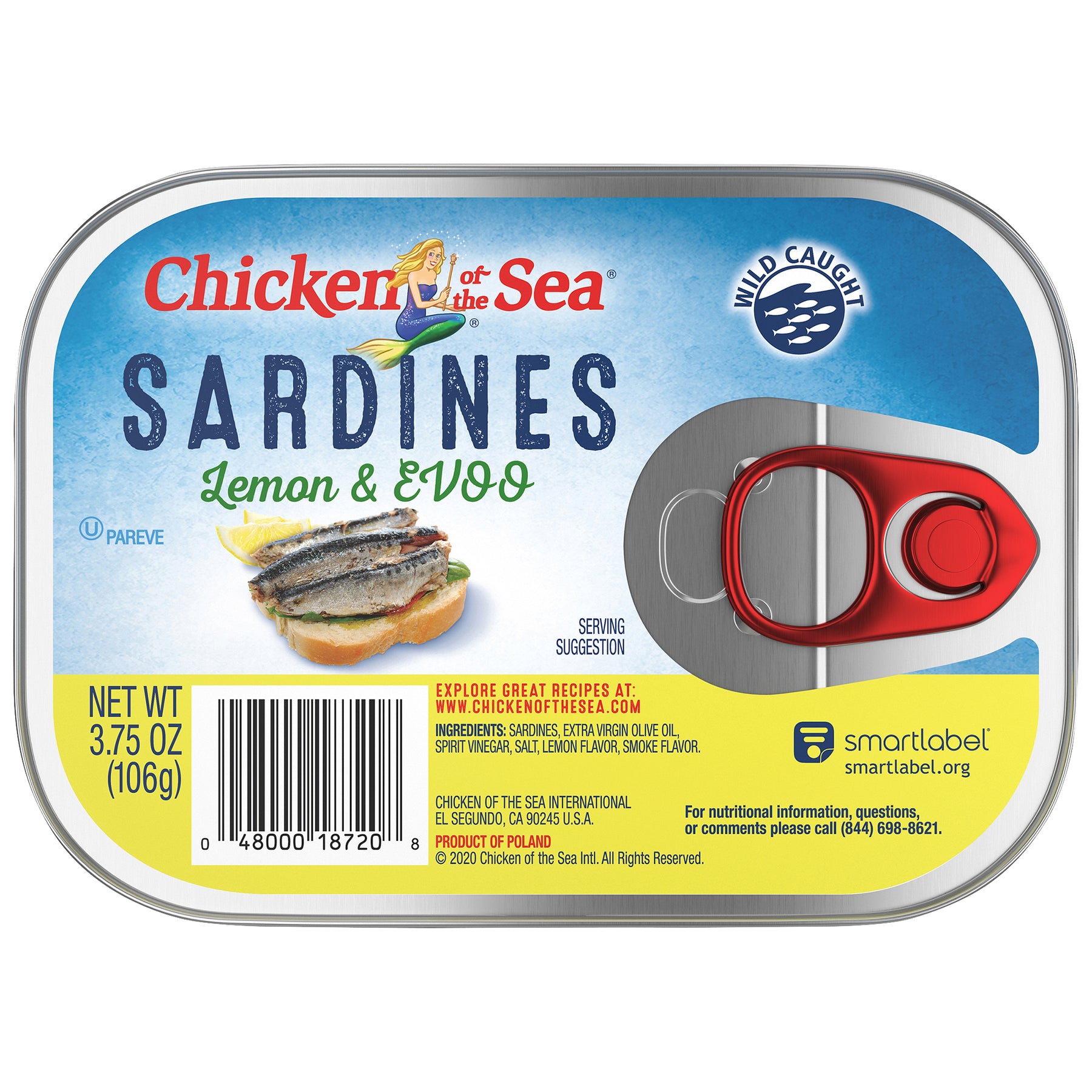 Our wild-caught sardines are a perfect starting point for your favorite recipes, shown here in a tangy and refreshing lemon and Extra Virgin Olive Oil combination. These sardines are sourced and packed in Europe, and are a great source of omega-3 and calcium. For recipe ideas visit chickenofthesea.com