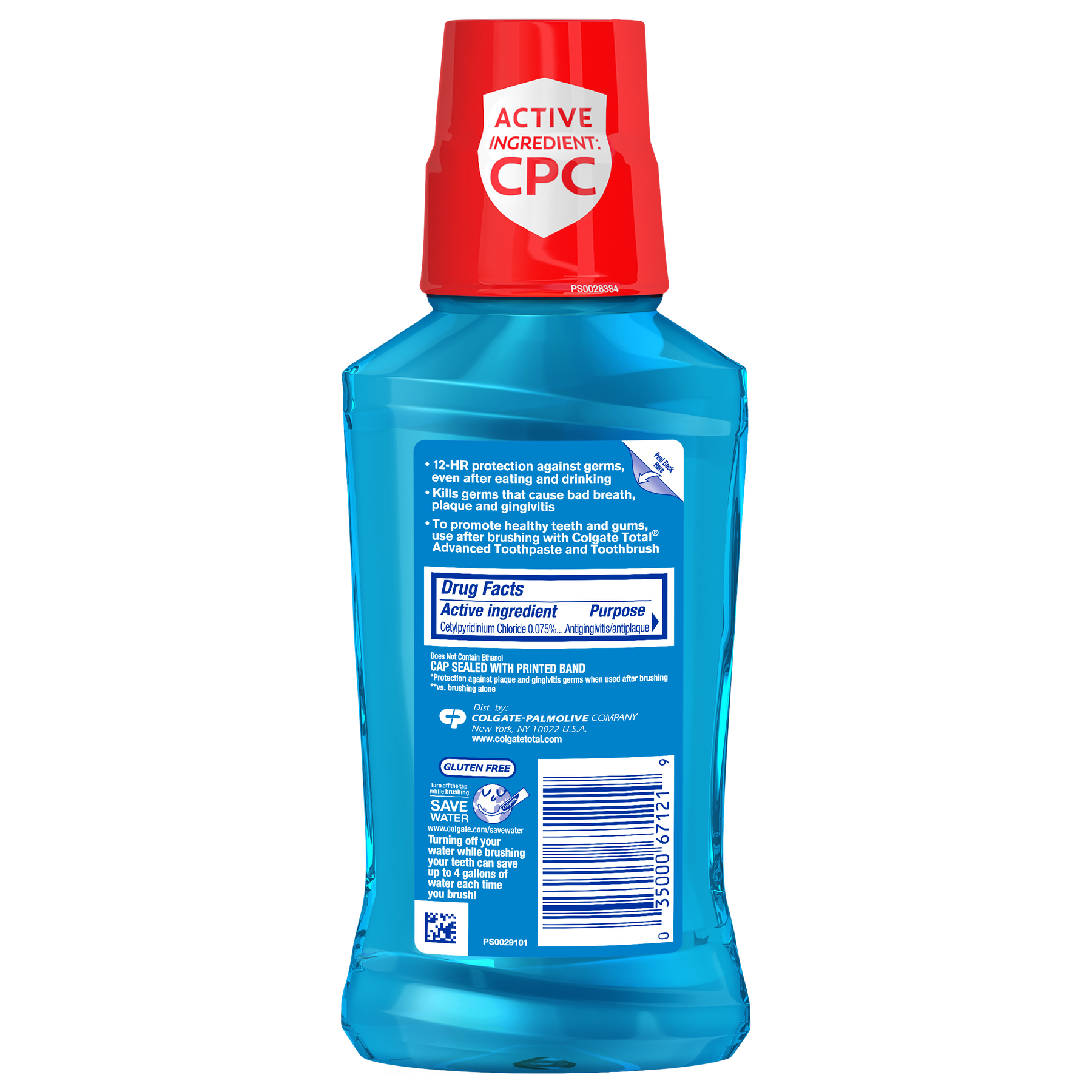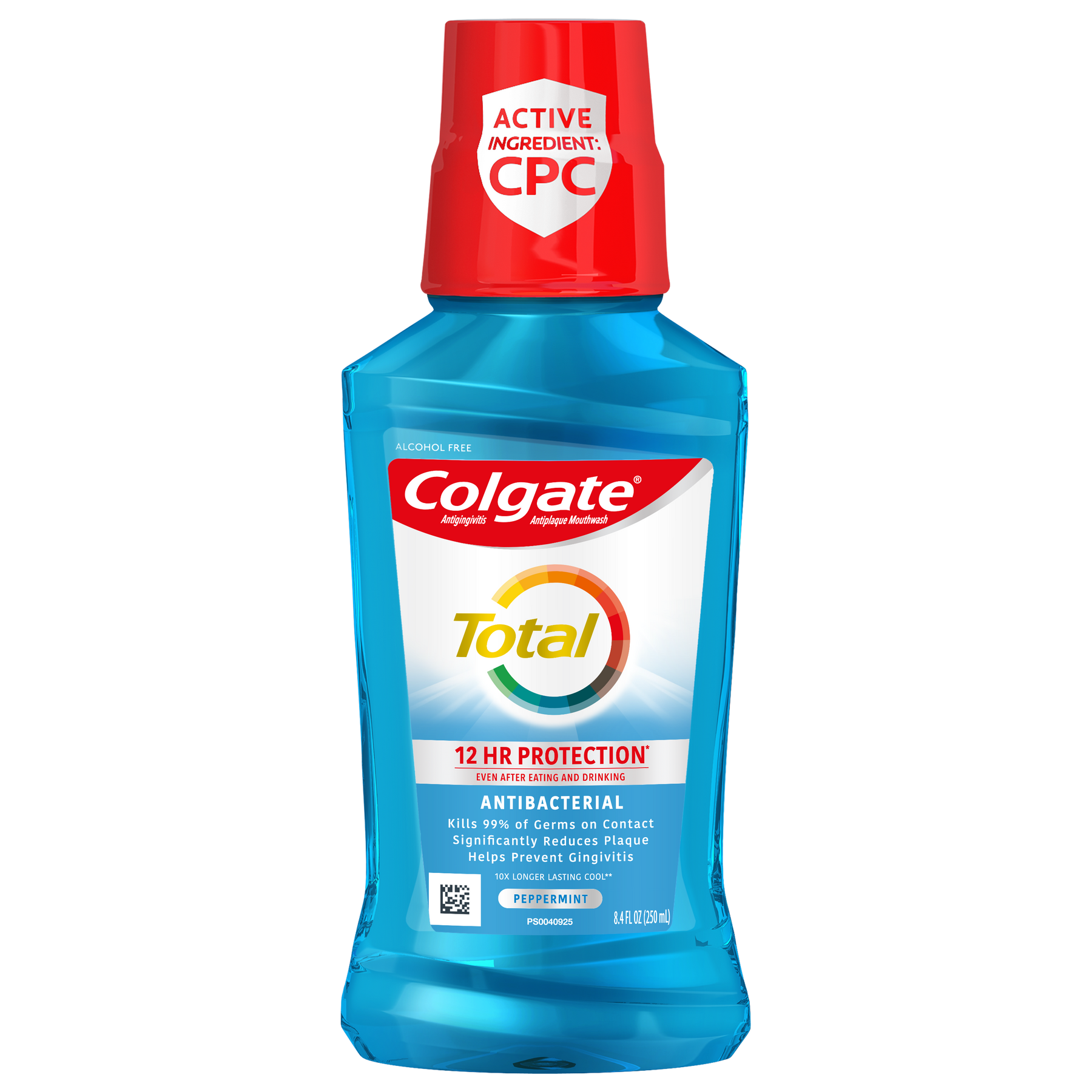 Colgate Total 12HR Pro-Shield Mouthwash doesn't just freshen breath, it provides 12-hour protection against germs, even after eating and drinking, helping to keep your mouth healthy and fresh. It kills 99% of germs on contact, significantly reduces plaque and helps prevent the gum disease gingivitis. Colgate Total 12HR Pro-Shield Mouthwash is an alcohol-free mouthwash (does not contain ethanol) and has a refreshing Peppermint Blast flavor.