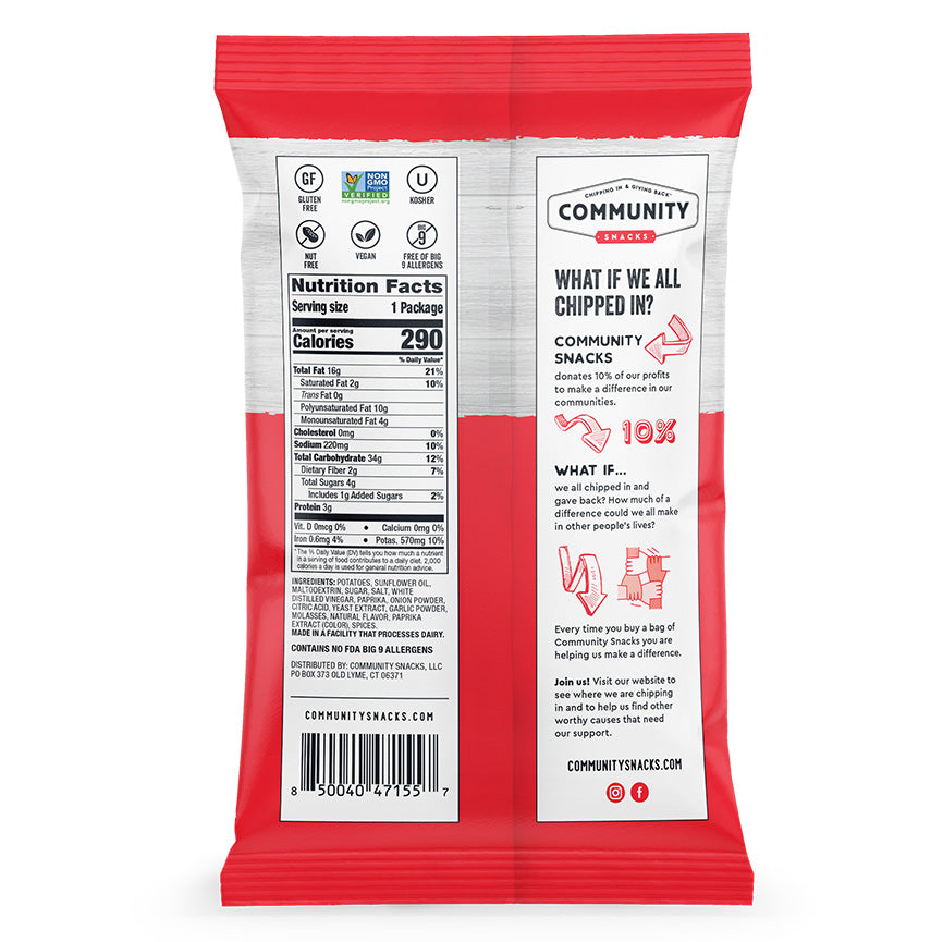 Indulge in the irresistible crunch of Community Snacks, where flavor meets purpose! Our kettle cooked potato chips come in eight mouthwatering varieties, each a symphony of taste and texture. From zesty jalapeño to classic sea salt, there is a chip for every craving. But we are not just about satisfying your snack cravings – we are committed to making a difference. With every savory bite, you are contributing to positive change. Community Snacks proudly donates 10% of its profits to food shares, ensuring that every bag purchased helps combat hunger in our communities. Join us in the delicious journey of giving back. Snack guilt-free, knowing you are not only treating your taste buds but also making a meaningful impact. Choose Community Snacks – where every chip brings joy, flavor, and support to those in need.