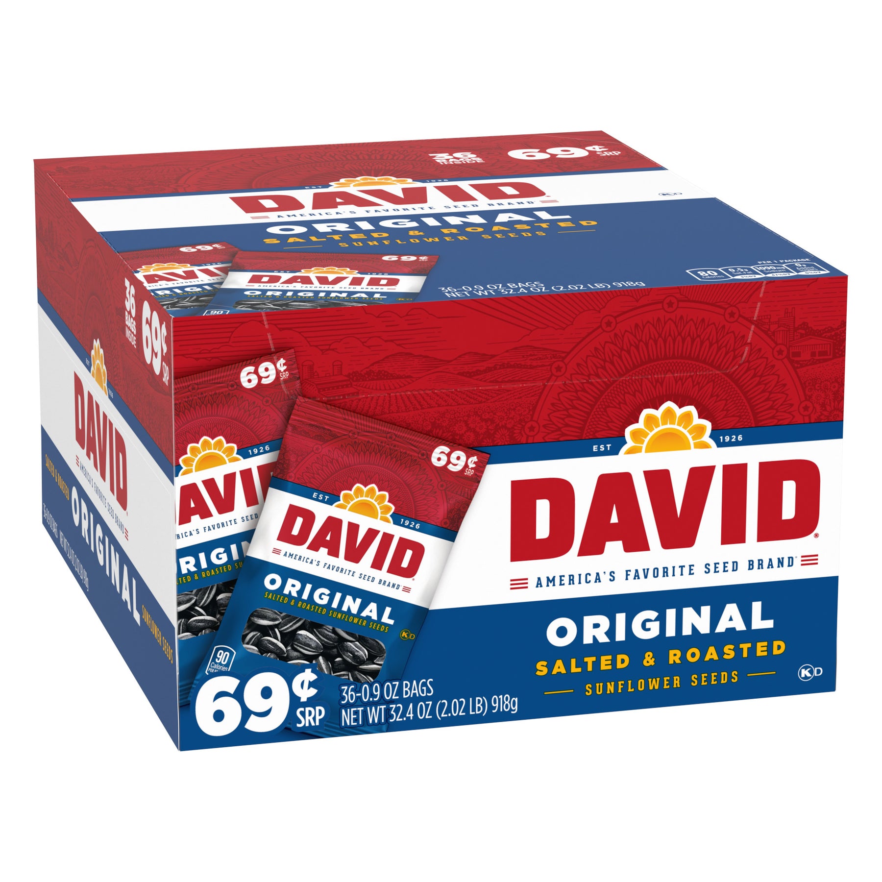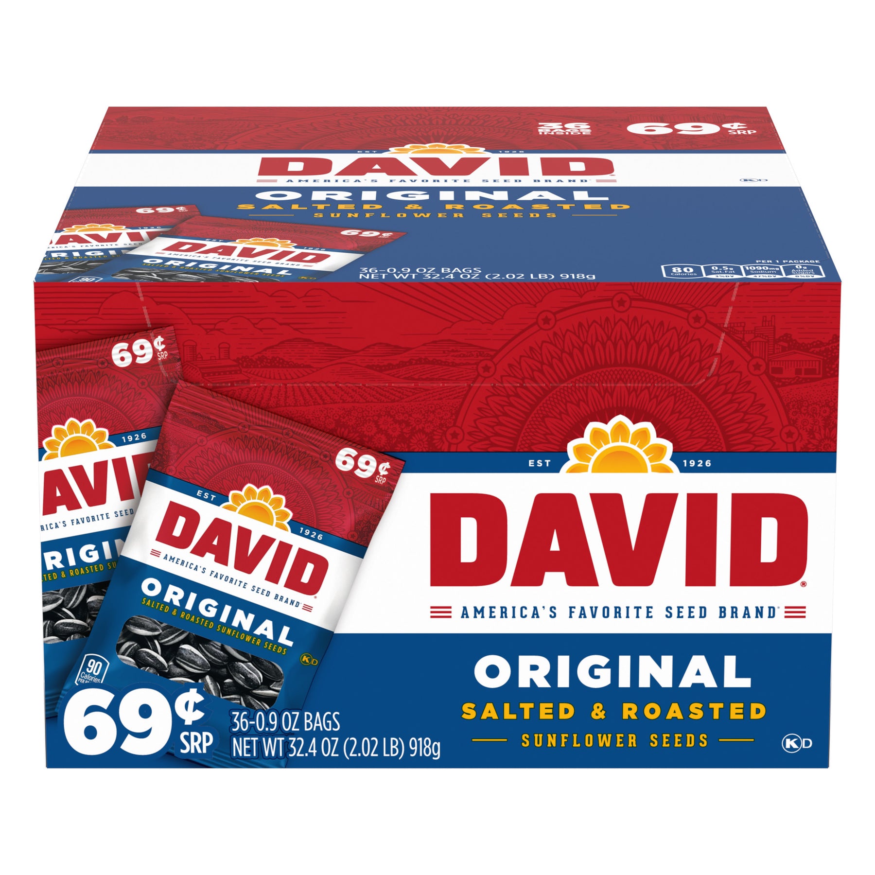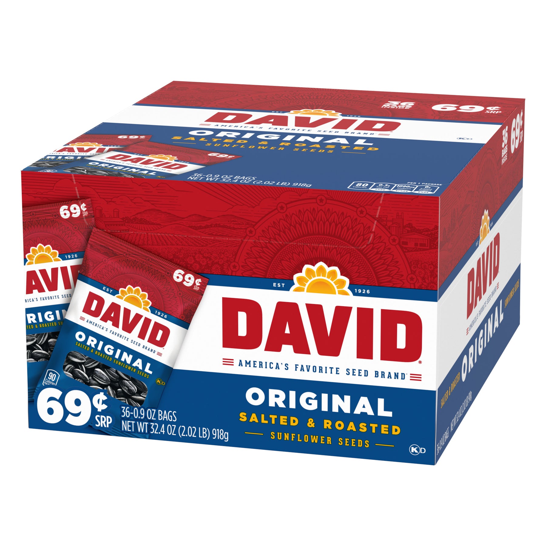 - Contains thirty-six 0.9 oz bags of DAVID Original Sunflower Seeds, great for group and solo snacking