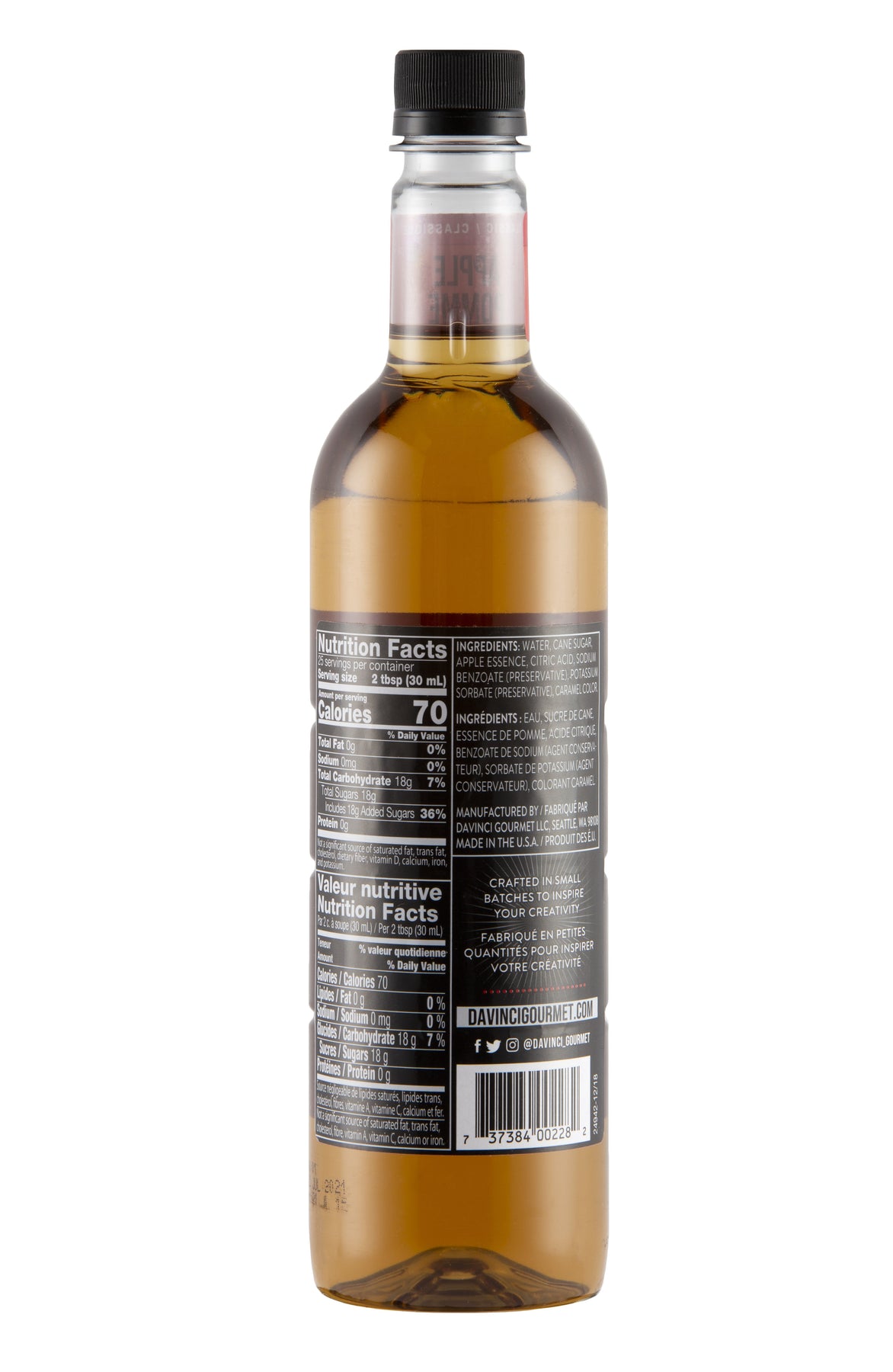 Customers will be pleased with DaVinci Gourmet Apple Syrup, is crafted in small batches to inspire coffees, crafted beverages, cocktails, culinary creations and more. Made with pure cane syrup this Apple flavor is a nostalgic flavor similar to a hard candy. Formulated to mix easily in a wide range of beverage and culinary applications. Great when added to soda water for a bright and fruity Italian Soda. DaVinci Gourmet Apple Syrup also resists curdling in dairy products, and perfectly holds its flavor in hot and cold beverages. Available in 4 count 750 mL plastic bottles. Since 1989 DaVinci Gourmet has created gourmet syrups suited for Café, Coffee Shops, Restaurants & Bars and at home. Formulated to mix easily in a wide range of beverage and culinary applications and perfectly holds its flavor in hot and cold beverages. Kosher and Gluten Free. DaVinci Gourmet syrups come in a full range of flavors in Classic, Sugar Free, Naturals and Fruit Innovations.