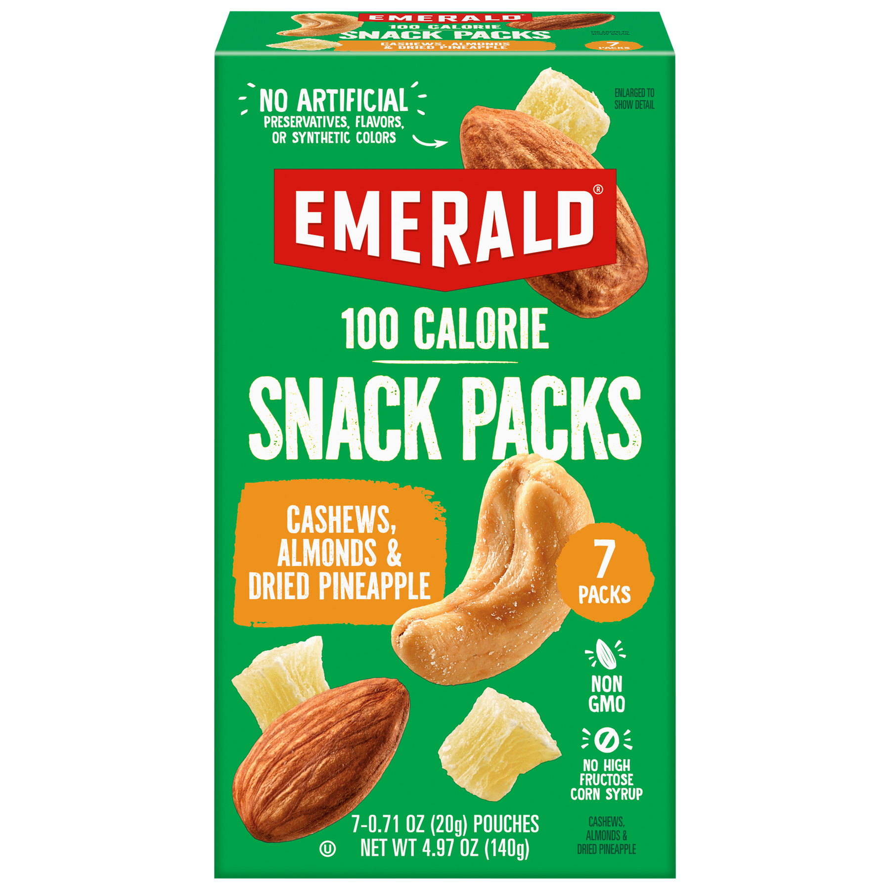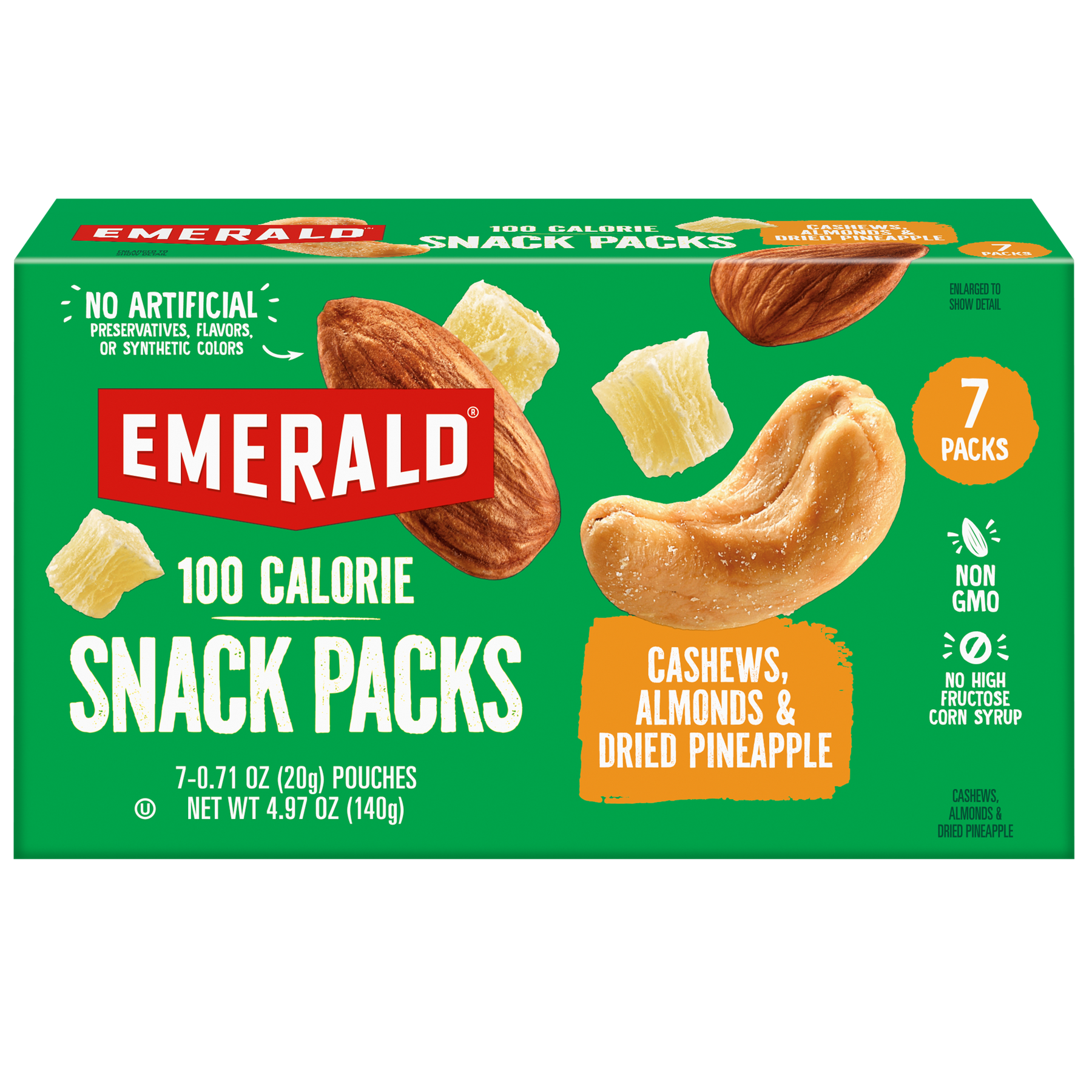 - 100-CALORIE PACKS: Emerald's Cashews & Almonds with Dried Pineapple 100-Calorie Packs are an irresistible trio! Delicious crunchy nuts mixed with the sweet goodness of dried pineapple pieces, these individually portioned snacks bring layers of flavor