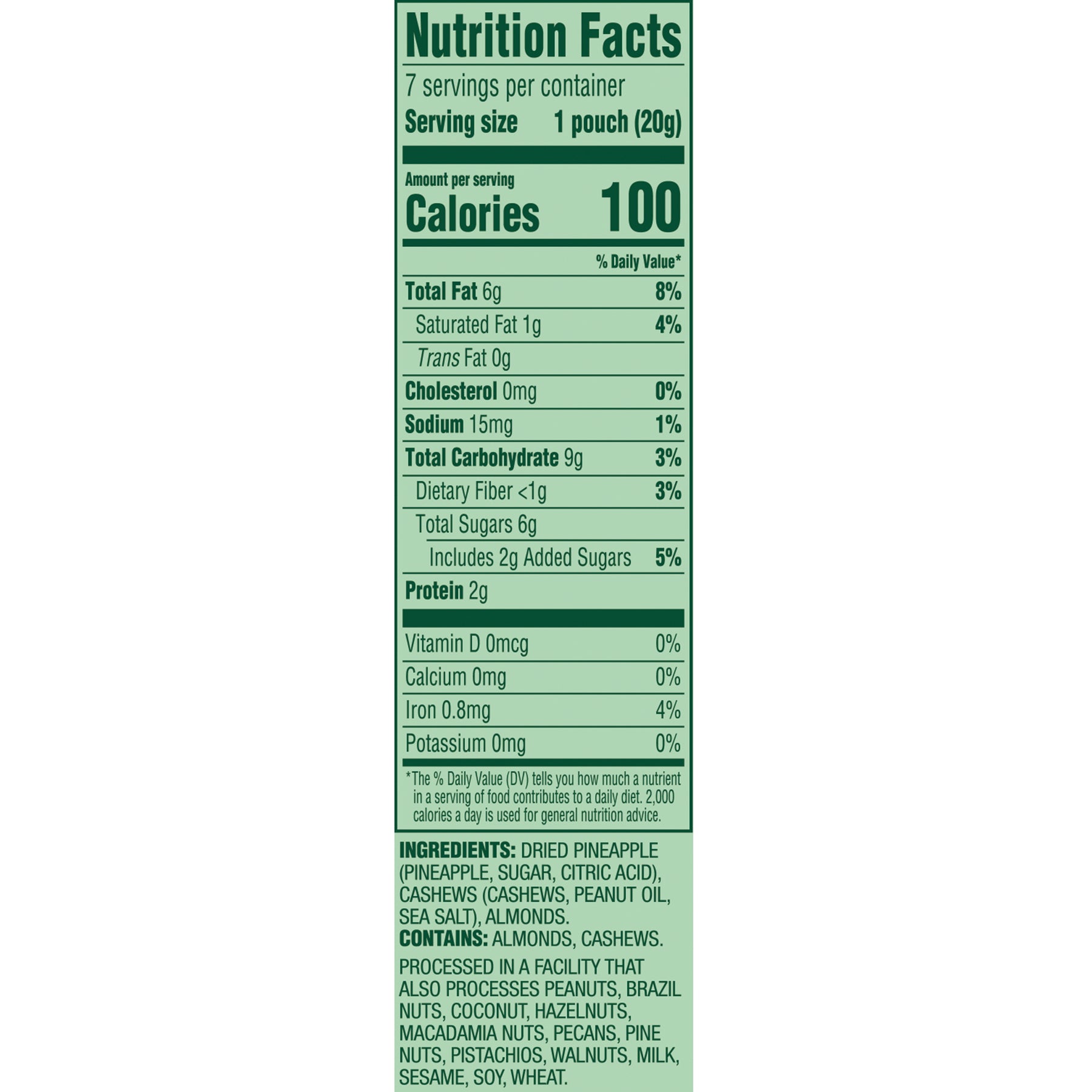 - A NUTRITIOUS CHOICE: Whole almonds, cashews and dried pineapple help fuel your day! Nuts and dried fruit are the ideal on-the-go, ready-to-eat, travel-friendly snack for kids and adults.