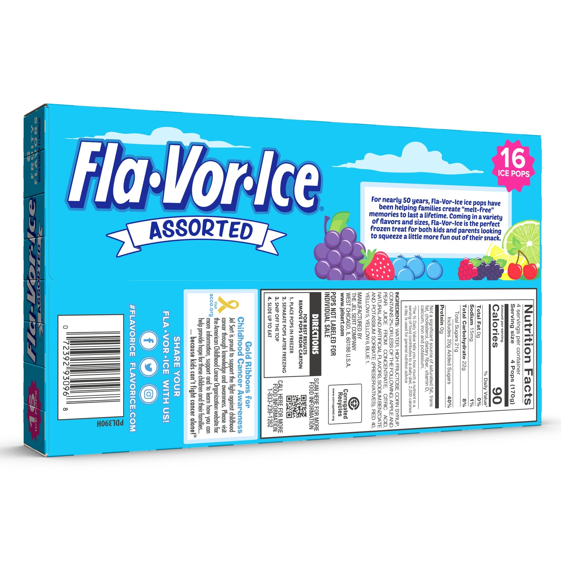 Fla-Vor-Ice has been an All-American recognized brand for 50 years. Available in Bold Fruity flavors that deliver great taste and refreshment anytime of the year. Fla-Vor-Ice is helping children with cancer and their families by promoting awareness and supporting the American Childhood Cancer Organization. Gluten Free, Fat Free and Kosher. Only 20 calories per pop.