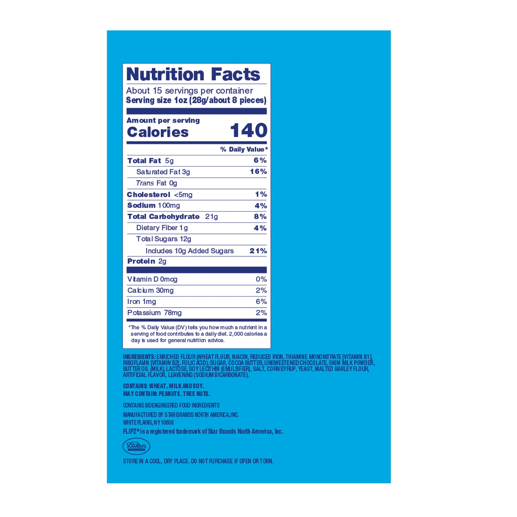 | Ingredients | Enriched Flour (Wheat Flour, Niacin, Reduced Iron, Thiamine Mononitrate [Vitamin B1], Riboflavin [Vitamin B2], Folic Acid), Sugar, Cocoa Butter, Unsweetened Chocolate, Skim Milk Powder, Butter Oil (Milk), Lactose, Soy Lecithin (Emulsifier), Salt, Corn Syrup, Yeast, Malted Barley Flour, Artificial Flavor, Leavening (Sodium Bicarbonate). |
