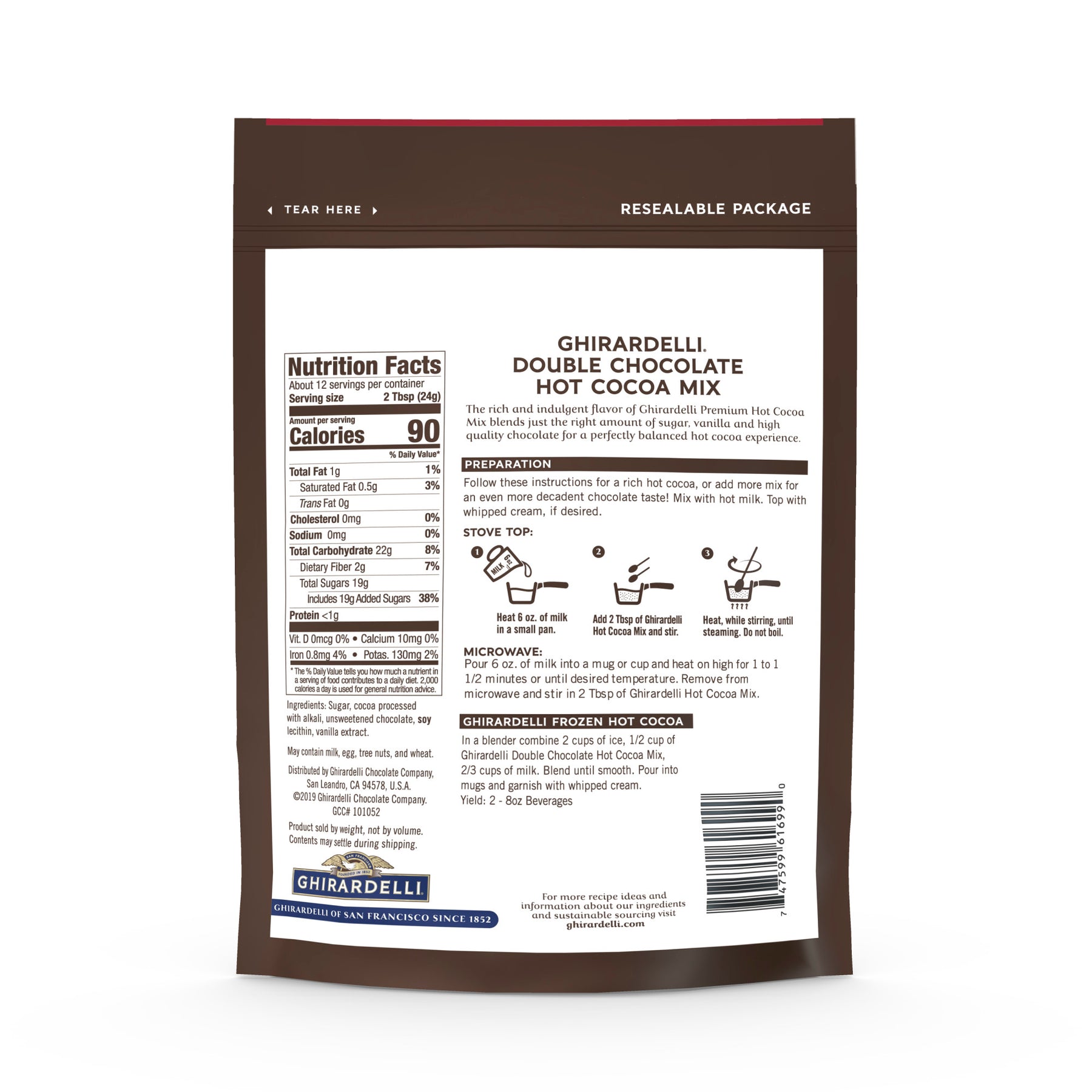 Stir up some decadence with velvety smooth Ghirardelli Double Chocolate Hot Cocoa Mix. This hot chocolate drink mix features cocoa blended with just the right amount of sugar, vanilla and high quality chocolate for a rich, perfectly balanced chocolate taste. Mix up some Ghirardelli hot cocoa to enjoy by the fire while reading your favorite book, or use it in a frozen hot chocolate recipe. Made with top quality cocoa beans, along with the perfect amount of sugar and vanilla, this hot chocolate beverage mix delivers the perfect balance of chocolatey sweetness in every sip. Ghirardelli hot cocoa powder is kosher certified. Ghirardelli Makes Life a Bite Better.