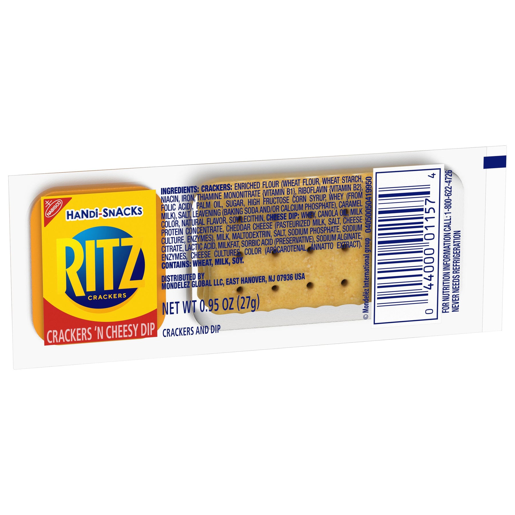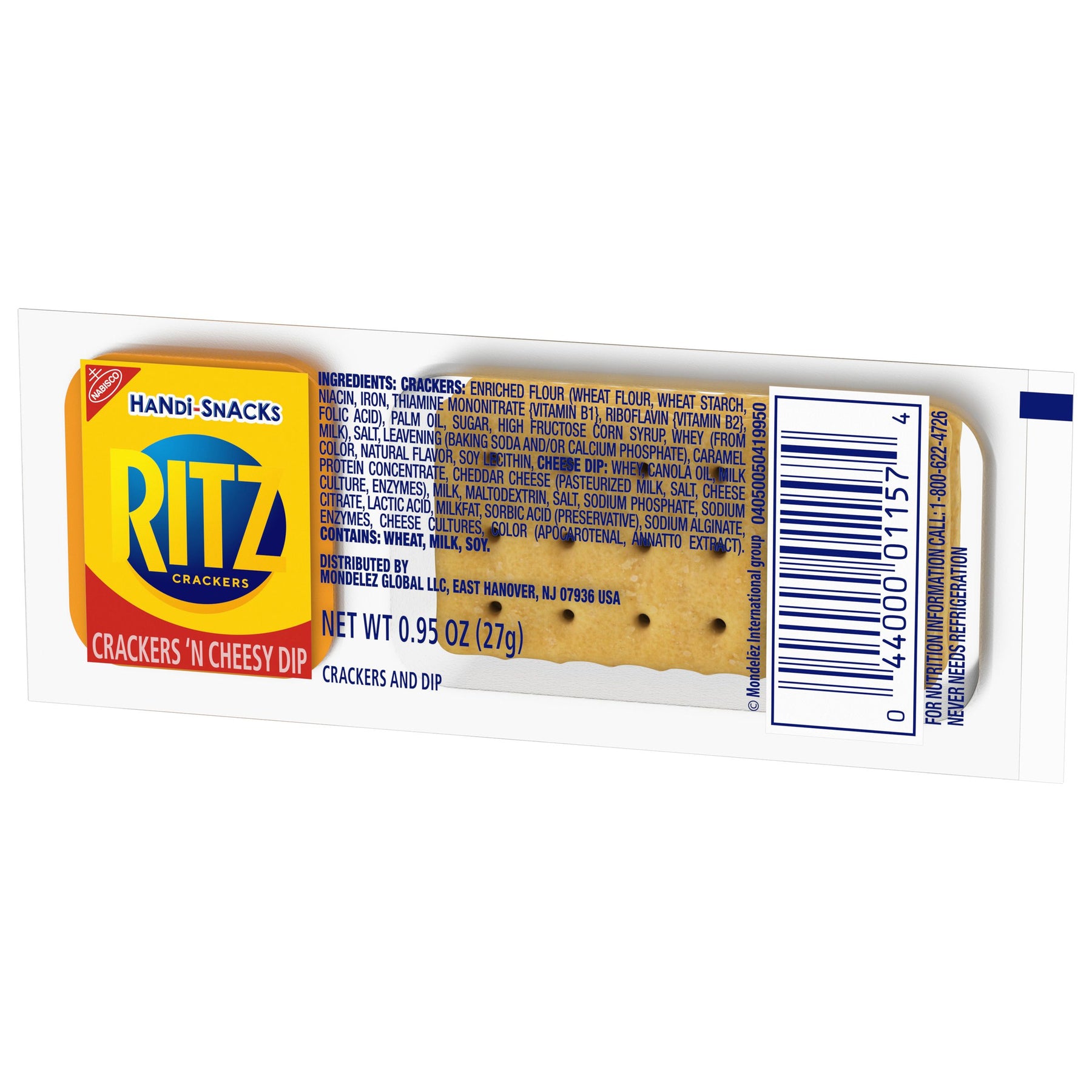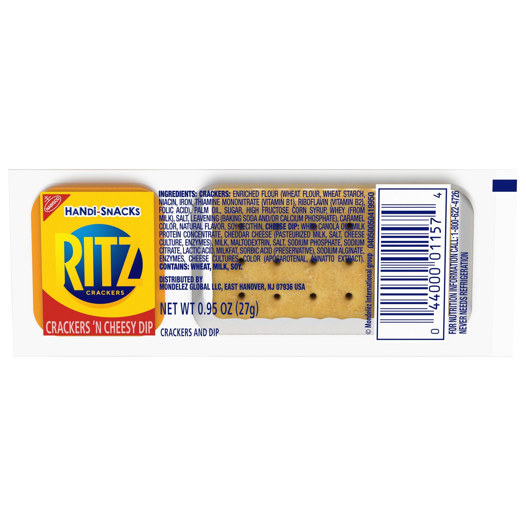 Handi-Snacks RITZ Crackers and Cheese Dip Snack Packs pair crunchy RITZ crackers with creamy cheese to make the perfect savory snack. These delicious cracker packs take classic RITZ crackers and the taste of smooth cheese and transform it into a fun, dippable treat. Toss these snack crackers into your lunchbox as a tasty snack, or stash them in your travel pack as a fun road trip treat.