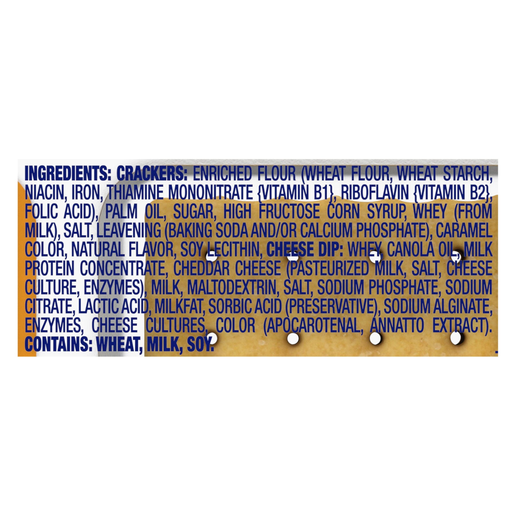 Ingredients | Crackers: Enriched Flour (Wheat Flour, Wheat Starch, Niacin, Iron, Thiamine Mononitrate {Vitamin B1}, Riboflavin {Vitamin B2}, Folic Acid), Palm Oil, Sugar, High Fructose Corn Syrup, Whey (From Milk), Salt, Leavening (Baking Soda And/Or Calcium Phosphate), Caramel Color, Natural Flavor, Soy Lecithin, Cheese Dip: Whey, Canola Oil, Milk Protein Concentrate, Cheddar Cheese (Pasteurized Milk, Salt, Cheese Culture, Enzymes), Milk, Maltodextrin, Salt, Sodium Phosphate, Sodium Citrate, Lactic Acid, Milkfat, Sorbic Acid (Preservative), Sodium Alginate, Enzymes, Cheese Cultures, Color (Apocarotenal, Annatto Extract). Contains: Wheat, Milk, Soy. |