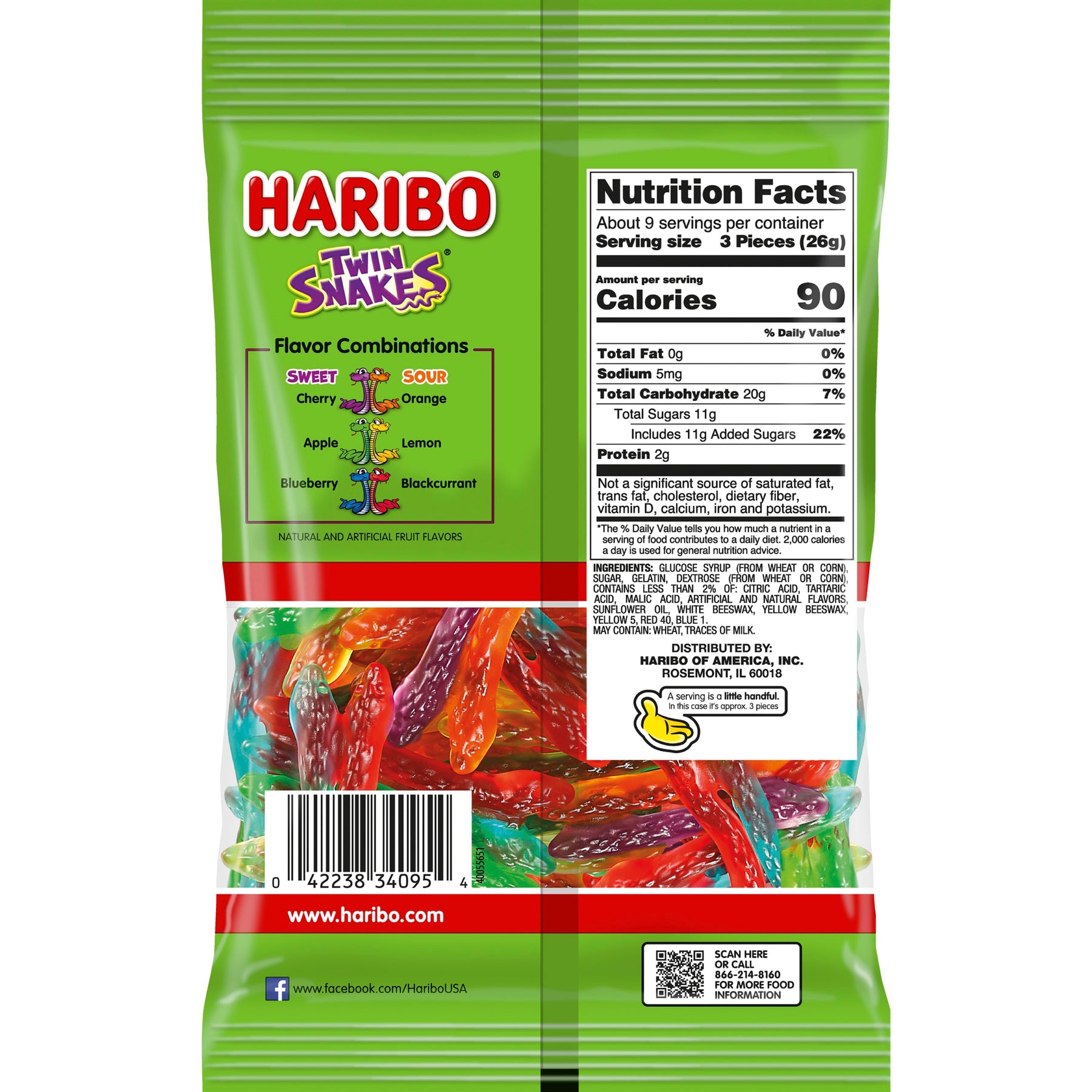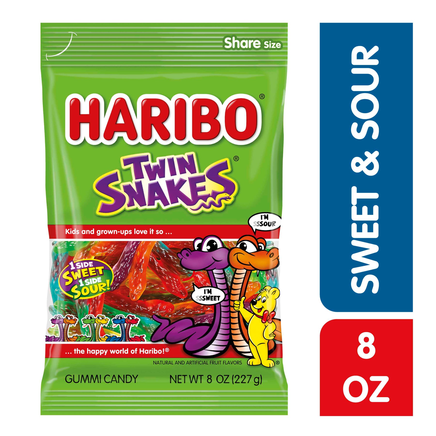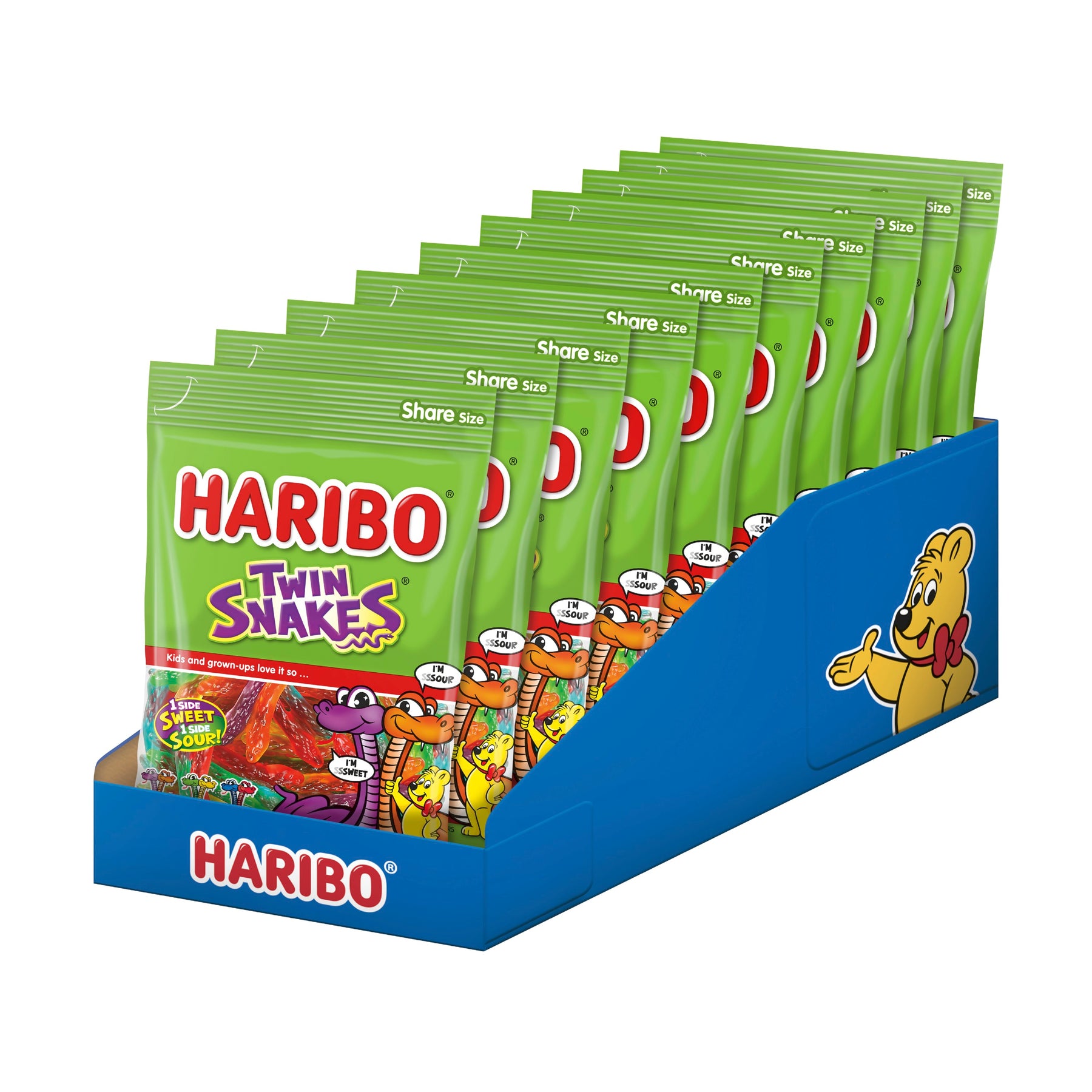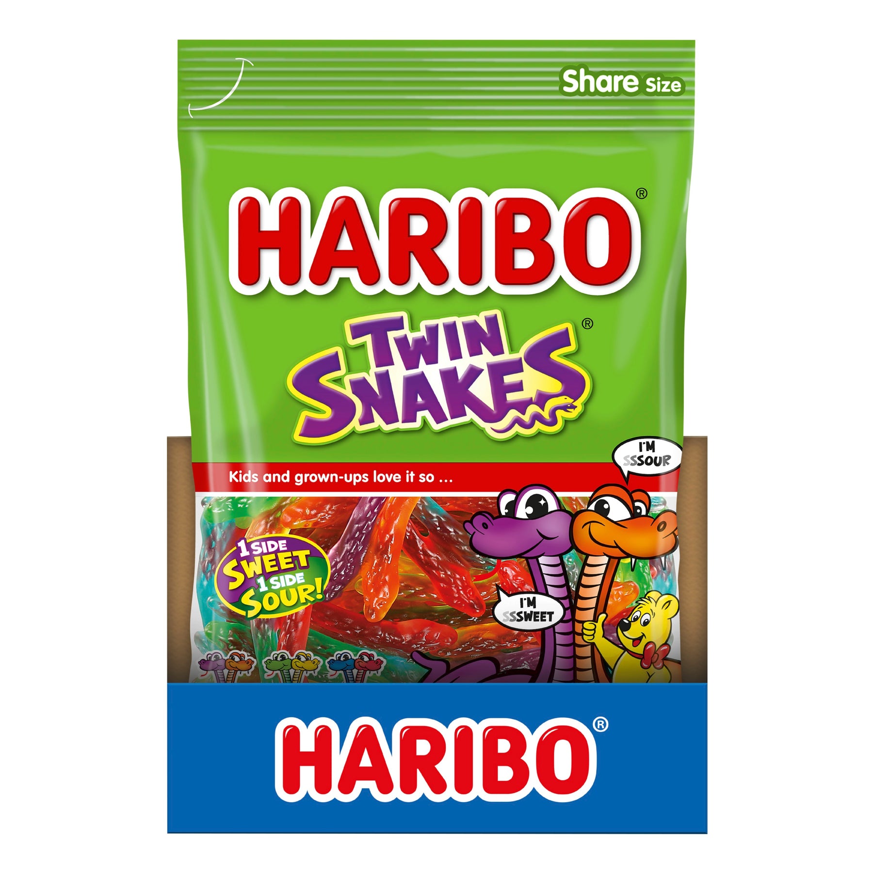HARIBO Twin Snakes takes gummy candy to the next level with a twist that brings endless possibilities for fun! Each snake is made up of two sides—one sweet and one sour—giving you the freedom to mix, match, or enjoy them separately. Whether you bite off the sweet side first, savor the sour side, rip them apart, or enjoy both sides together, the choice is yours for a truly adventurous treat. These snakes come in a variety of flavor combinations: Sweet Cherry and Sour Orange, Sweet Blueberry and Sour Blackcurrant, Sweet Apple and Sour Lemon. With each flavor duo offering its own unique sweet and sour balance, every bite is sure to surprise and delight. Whether you're sharing with friends or enjoying on your own, HARIBO Twin Snakes are the perfect treat for anyone looking to add a little extra fun to their day. Kids and grown-ups love it so, the happy world of HARIBO!HARIBO Twin Snakes takes gummy candy to the next level with a twist that brings endless possibilities for fun! Each snake is made up of two sides—one sweet and one sour—giving you the freedom to mix, match, or enjoy them separately. Whether you bite off the sweet side first, savor the sour side, rip them apart, or enjoy both sides together, the choice is yours for a truly adventurous treat. These snakes come in a variety of flavor combinations: Sweet Cherry and Sour Orange, Sweet Blueberry and Sour Blackcurrant, Sweet Apple and Sour Lemon. With each flavor duo offering its own unique sweet and sour balance, every bite is sure to surprise and delight. Whether you're sharing with friends or enjoying on your own, HARIBO Twin Snakes are the perfect treat for anyone looking to add a little extra fun to their day. Kids and grown-ups love it so, the happy world of HARIBO!