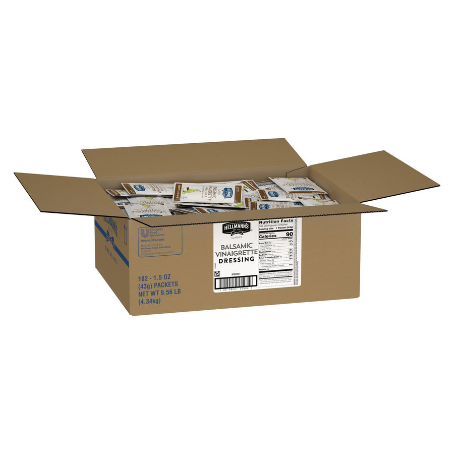 With its balanced acidity and subtle onion and herb notes, Hellmann's Classic Balsamic Vinaigrette Salad Dressing Portion Control Sachets make a versatile addition to any foodservice kitchen. This gluten-free balsamic vinegar dressing is made with real, simple ingredients that your guests can trust, and it contains no high fructose corn syrup or artificial flavors. It has a subtly sweet, balanced flavor profile, making it a delicious addition to a variety of your dishes. This salad dressing has a hand-whisked vinaigrette texture and can be shaken to create a natural emulsion. It has a premium look and mouth feel that is sure to leave your guests with a positive impression. And since it comes packaged in convenient 1.5-ounce balsamic vinaigrette salad dressing packets, it makes it easy for patrons to serve just the right amount.