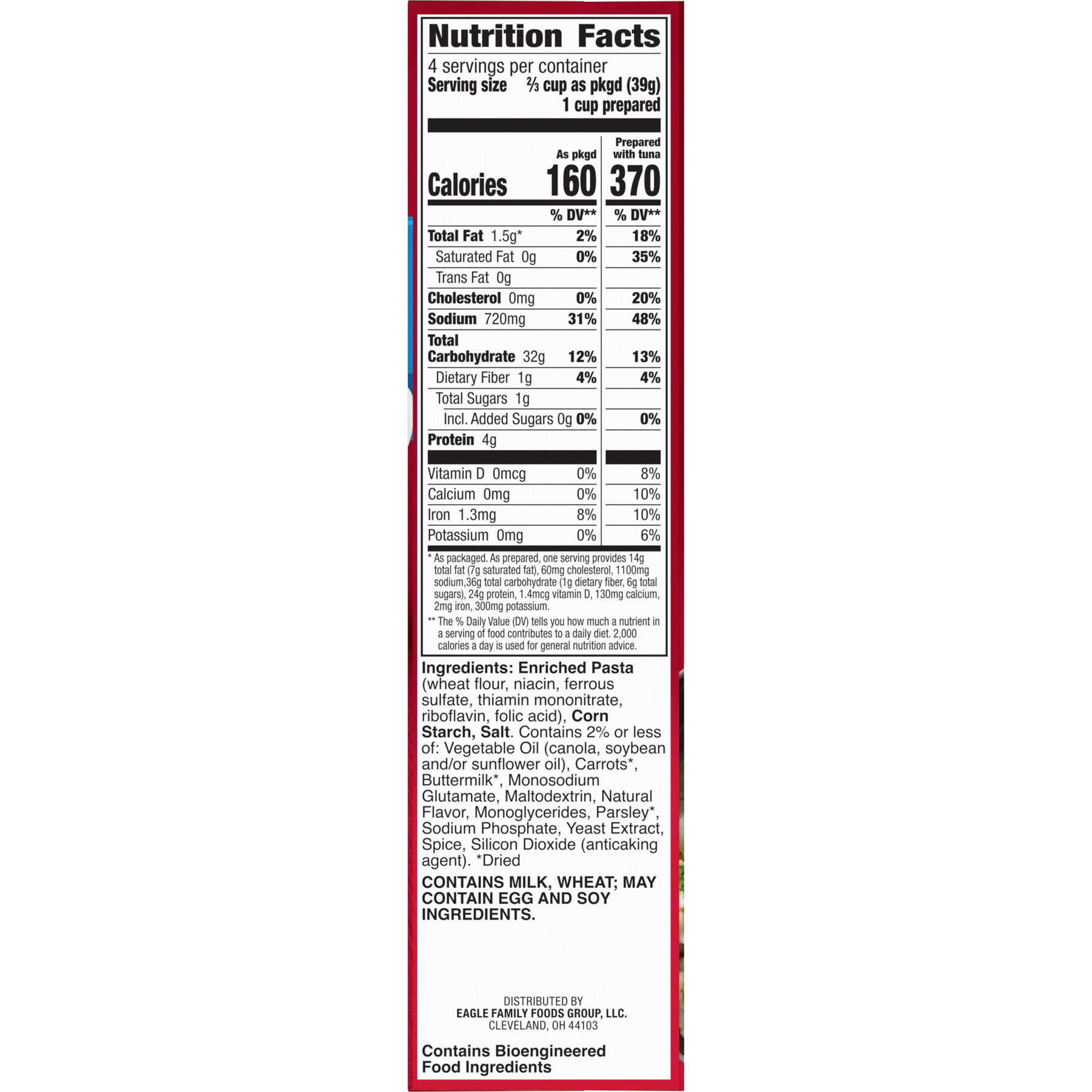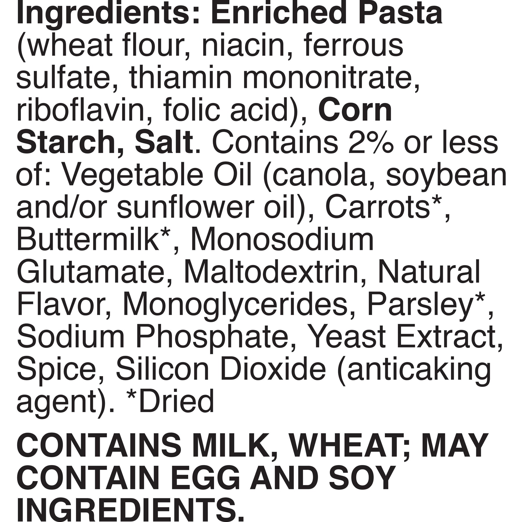 Ingredients | Enriched Pasta(Wheat Flour, Niacin, Ferroussulfate, Thiamin Mononitrate, Riboflavin, Folic Acid), Cornstarch, Salt.Contains 2% Or Lessof: Vegetable Oil (Canola, Soybeanand/Or Sunflower Oil), Carrots*, Buttermilk*, Monosodiumglutamate, Maltodextrin, Naturalflavor, Monoglycerides, Parsley*, Sodium Phosphate, Yeast Extract, Spice, Silicon Dioxide (Anticakingagent).*Dried |