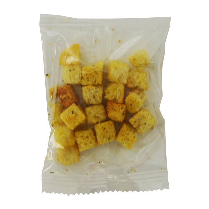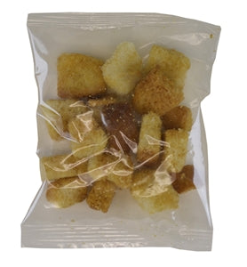 Seasoned cut croutons in .25 oz single serve portions are perfect for to go or delivery. Croutons add the perfect crunch and seasoning to soups or salads. Single serve pouches allow for less handling of the product (and convey safety to customers), requires less labor, controls food costs and delivers a consistently crunchy product. The croutons are a perfect sized cube; the seasoning is a consumer favorite combination that blends well with a variety of recipe applications. These portioned crispy croutons complement many menu options and add texture and crave able taste. These are packaged for single serve to add convenience for your consumer.