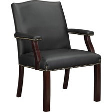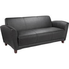 Sofa is part of the Lorell Reception Seating Collection that is made with an open, inviting modern design and bonded black leather. Back meets the seat at a slight obtuse angle for a relaxing wait. Sides rise for armrests. Comfortable, thick foam cushions are CA117 fire-retardant. Four sturdy, wooden legs with a Mahogany finish support the sofa built for three. Overall weight capacity is 650 lb. with a 215 lb. capacity for each seat.