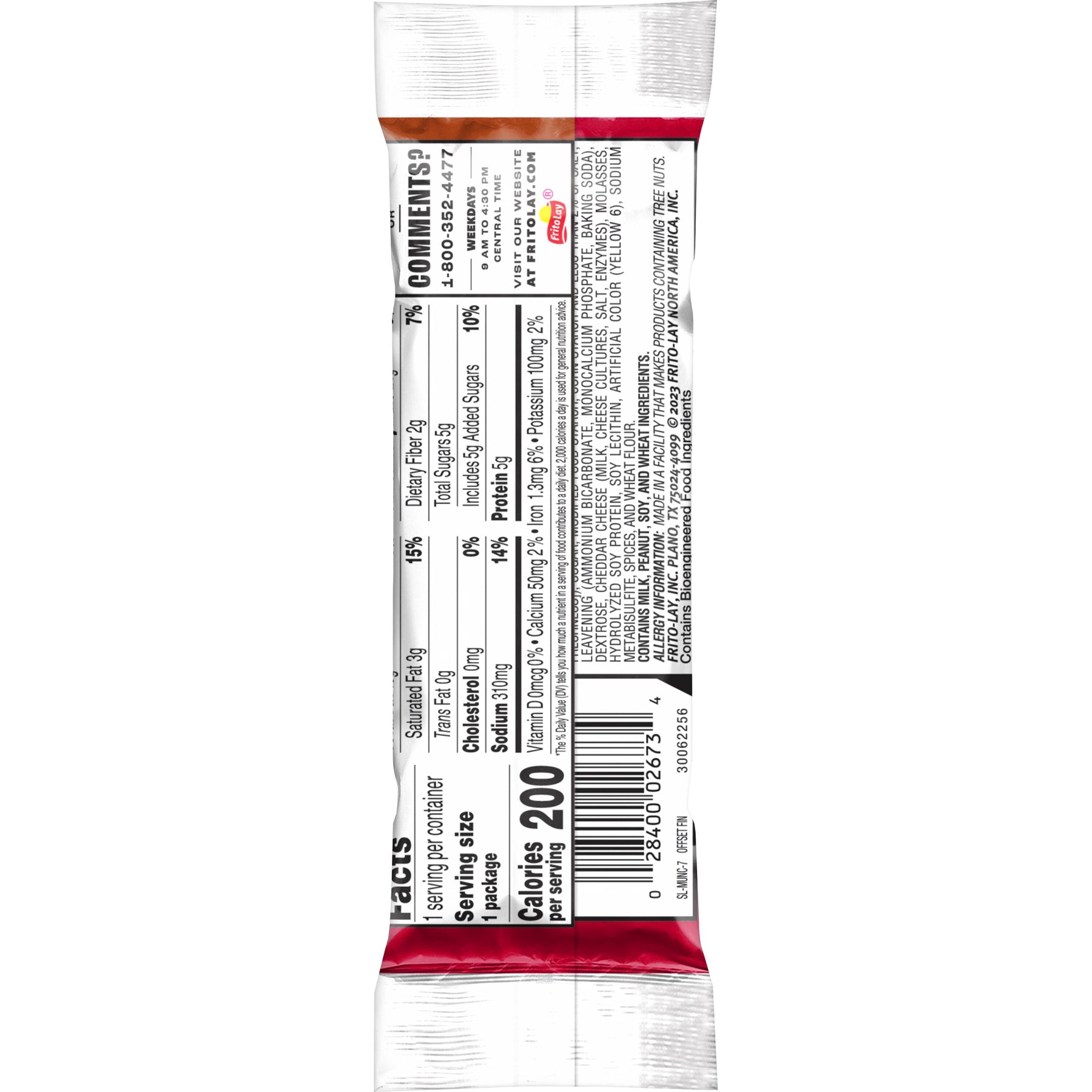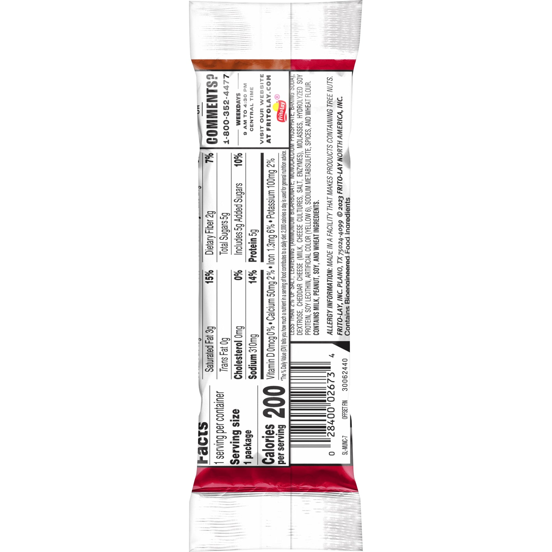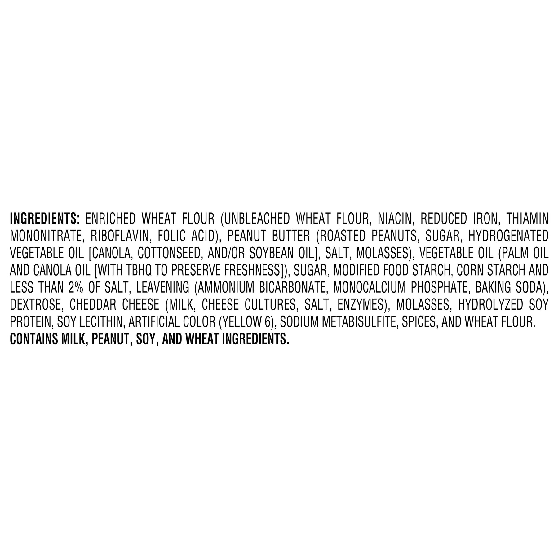 Ingredients | Enriched Wheat Flour (Unbleached Wheat Flour, Niacin, Reduced Iron, Thiamin Mononitrate, Riboflavin, Folic Acid), Peanut Butter (Roasted Peanuts, Sugar, Hydrogenated Vegetable Oil [Canola, Cottonseed, And/Or Soybean Oil], Salt, Molasses), Vegetable Oil (Palm Oil And Canola Oil [With Tbhq To Preserve Freshness]), Sugar, Modified Food Starch, Corn Starch And Less Than 2% Of Salt, Leavening (Ammonium Bicarbonate, Monocalcium Phosphate, Baking Soda), Dextrose, Cheddar Cheese (Milk, Cheese Cultures, Salt, Enzymes), Molasses, Hydrolyzed Soy Protein, Soy Lecithin, Artificial Color (Yellow 6), Sodium Metabisulfite, Spices, And Wheat Flour. .Contains Milk, Peanut, Soy, Wheat Ingredients. |