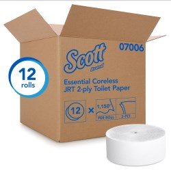 Kimberly-Clark Professional™ Scott® Essential™ Coreless Jumbo Roll Toilet Paper provides a reliable balance of efficiency, performance and value. Selecting Scott® Essential Jumbo Roll Coreless Toilet Paper is a smart choice for your business. It brings you high capacity and each roll offers 15% more than standard jumbo roll toilet paper brands, so you'll have to order less frequently. It's an economical choice, but thanks to its 2ply design, it's also soft and durable. Scott® coreless bath tissue meets EPA guidelines for post-consumer waste, is FSC® and ECOLOGO® Certified, and sewer and septic safe. It's elemental chlorine-free (ECF) and reduces packaging waste with 100% elimination of core waste when compared to cored commercial jumbo rolls. The product has dimensions of 3.78"x1150' and comes in a case of 12 rolls.