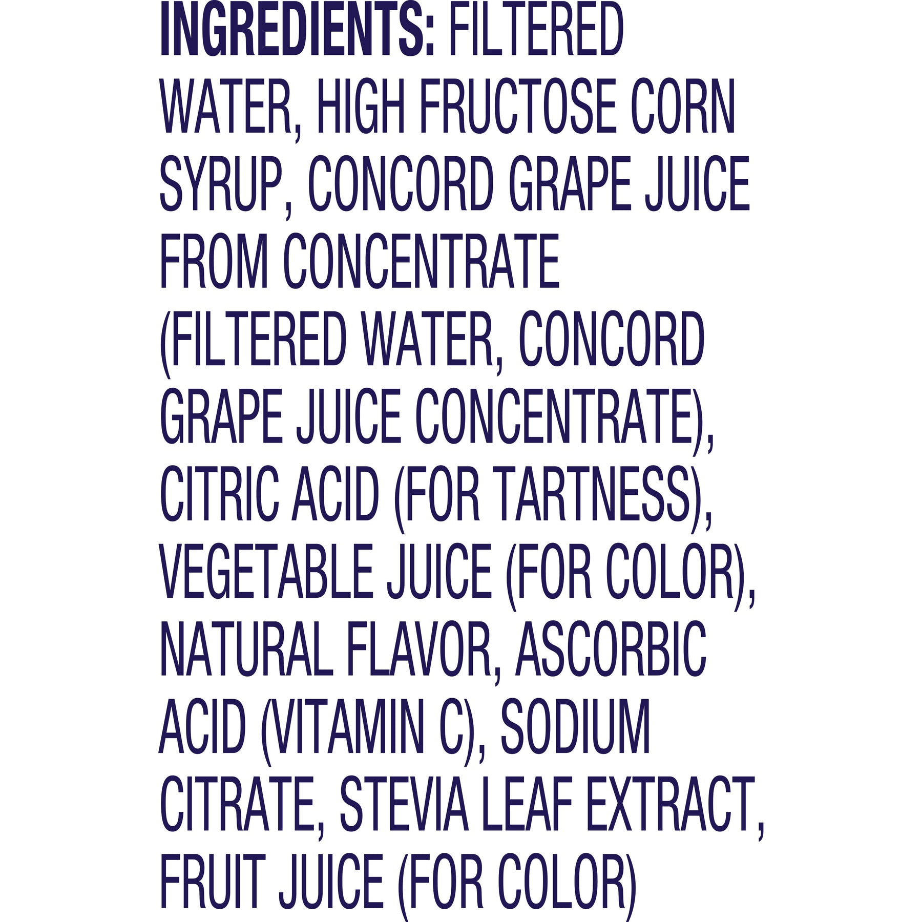 Ingredients | Filtered Water, High Fructose Corn Syrup, Concord Grape Juice From Concentrate (Filtered Water, Concord Grape Juice Concentrate), Citric Acid (For Tartness), Vegetable Juice (For Color), Natural Flavor, Ascorbic Acid (Vitamin C), Sodium Citrate, Stevia Leaf Extract, Fruit Juice (For Color) |