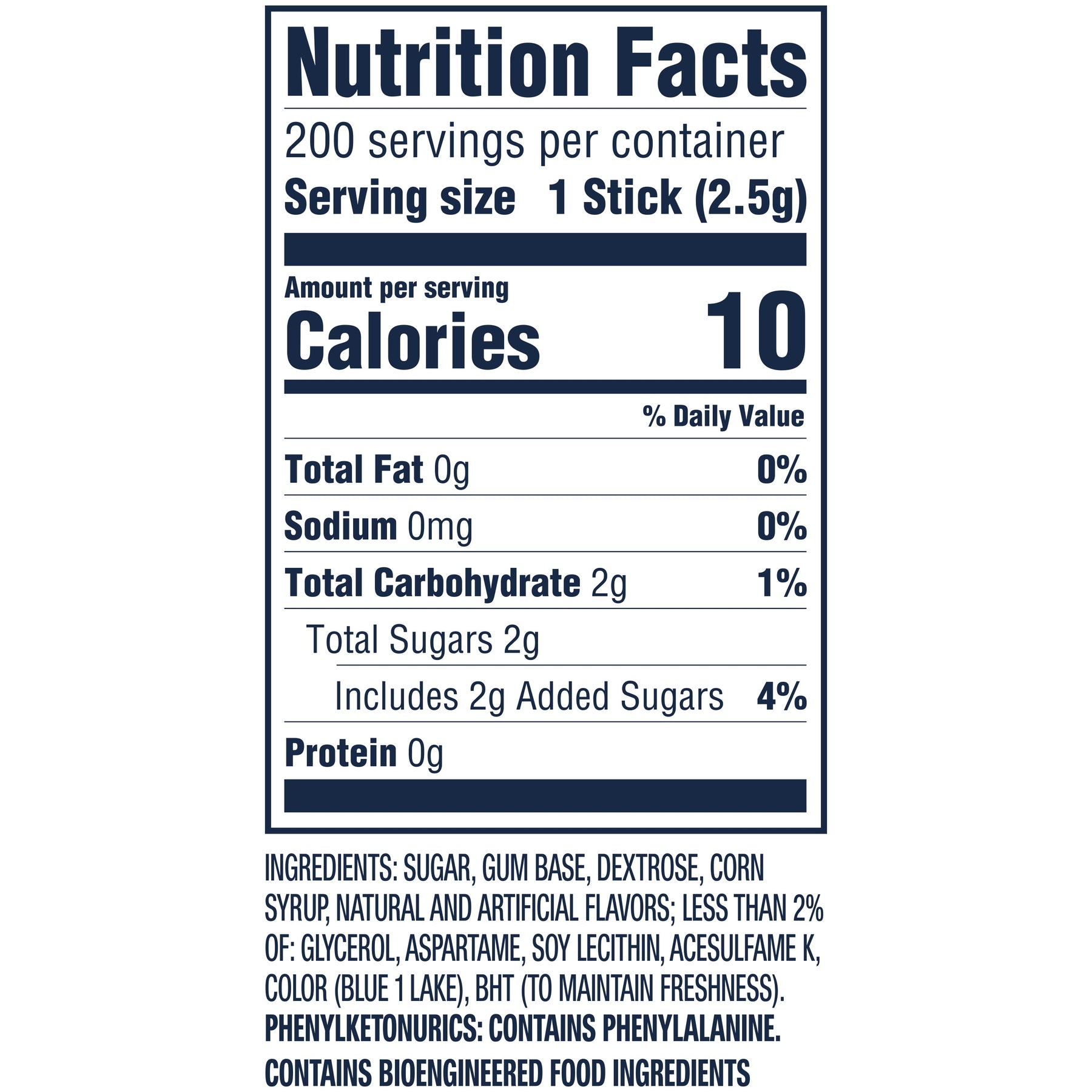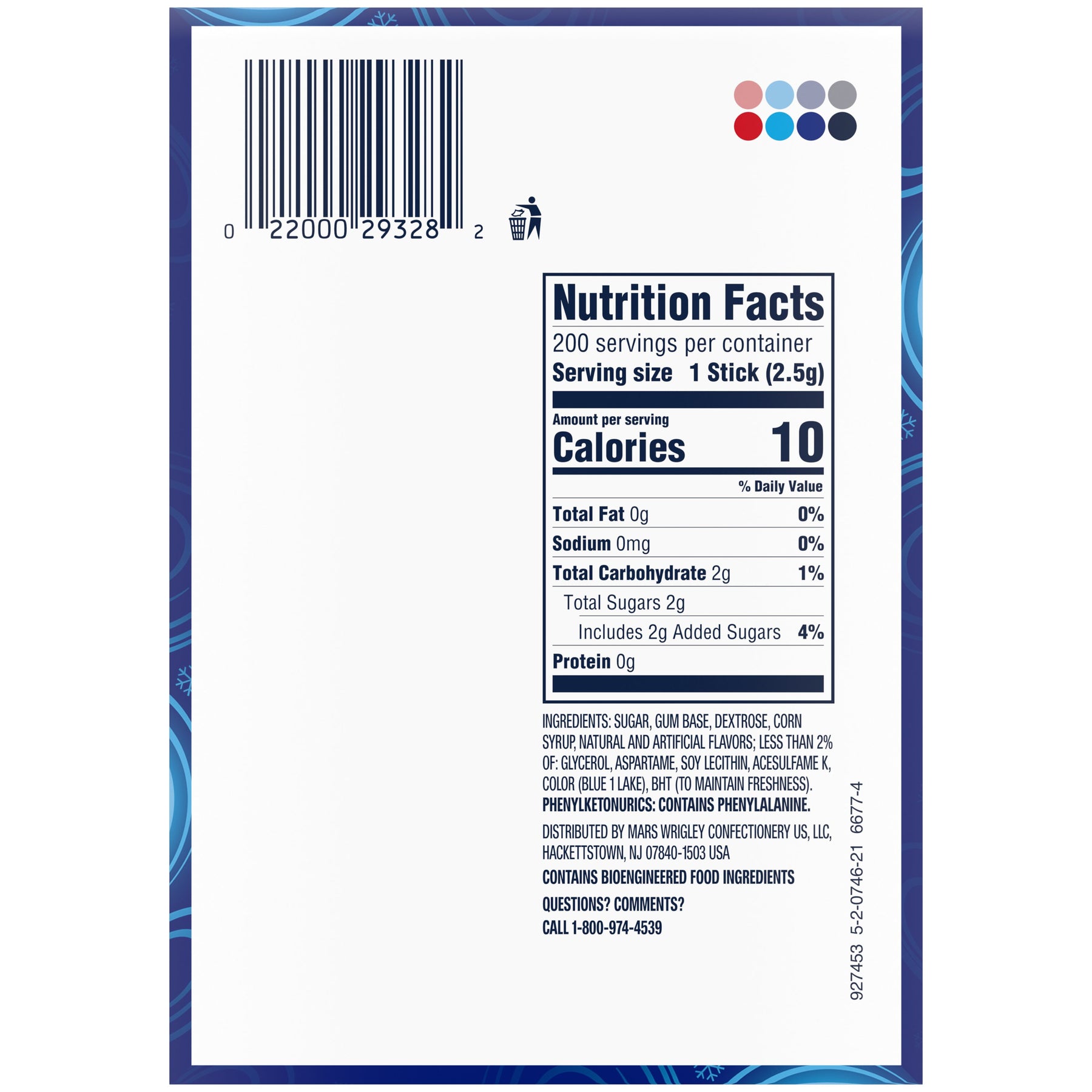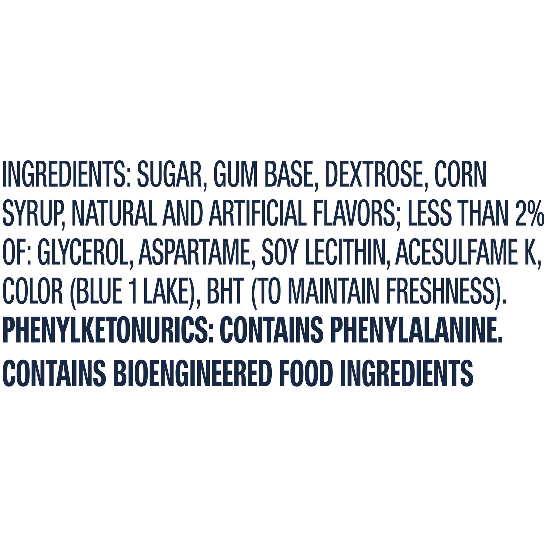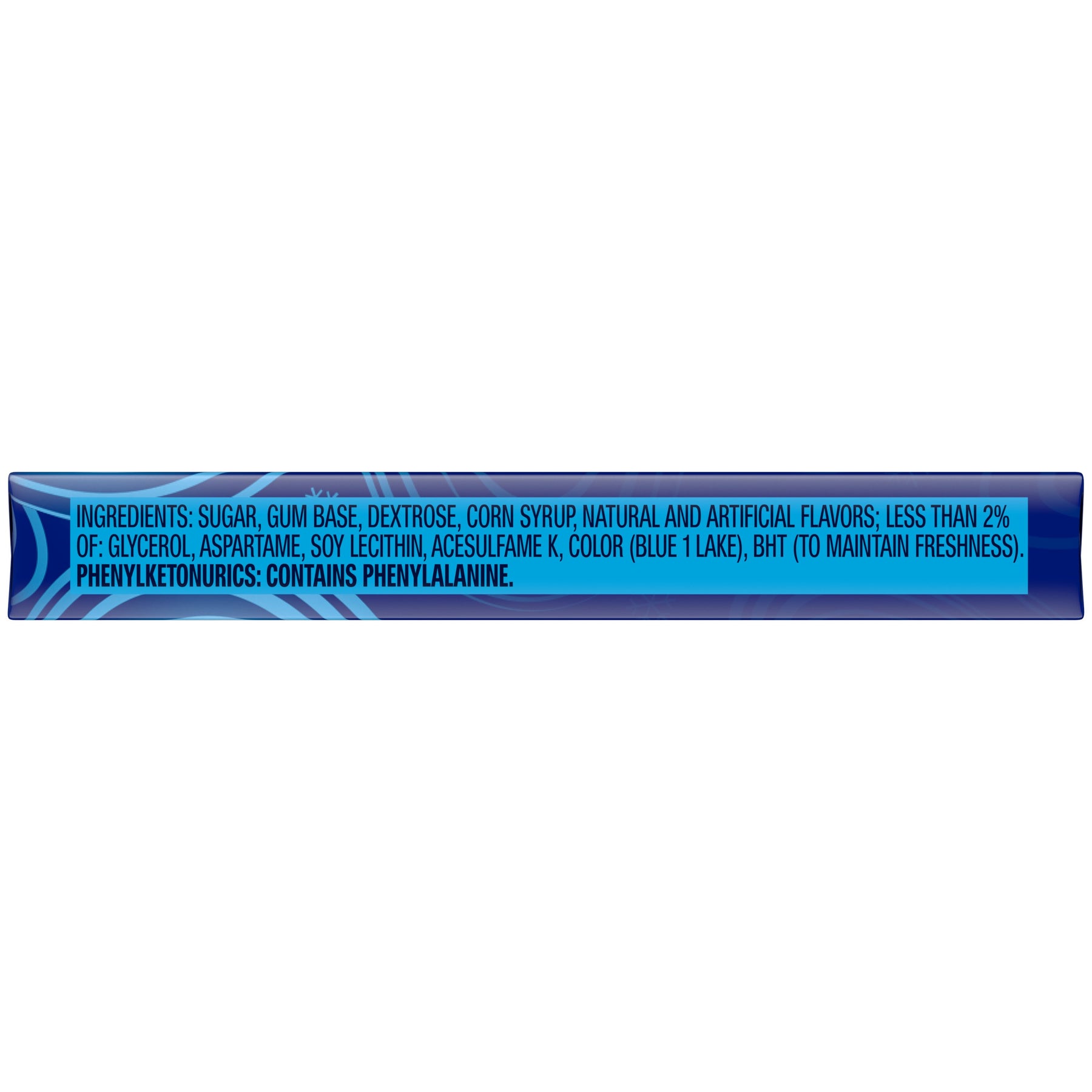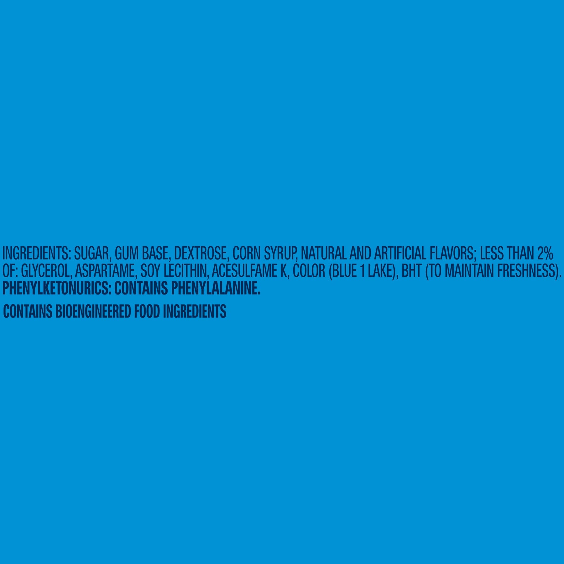 Ingredients | Sugar, Gum Base, Dextrose, Corn Syrup, Natural And Artificial Flavors; Less Than 2% Of: Glycerol, Aspartame, Soy Lecithin, Acesulfame K, Color (Blue 1 Lake), Bht (To Maintain Freshness). |